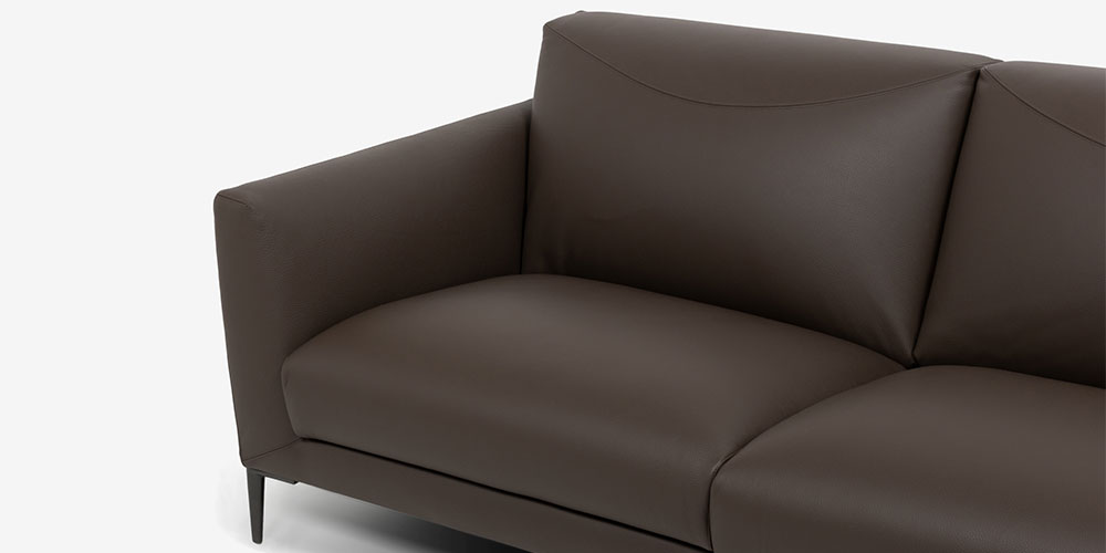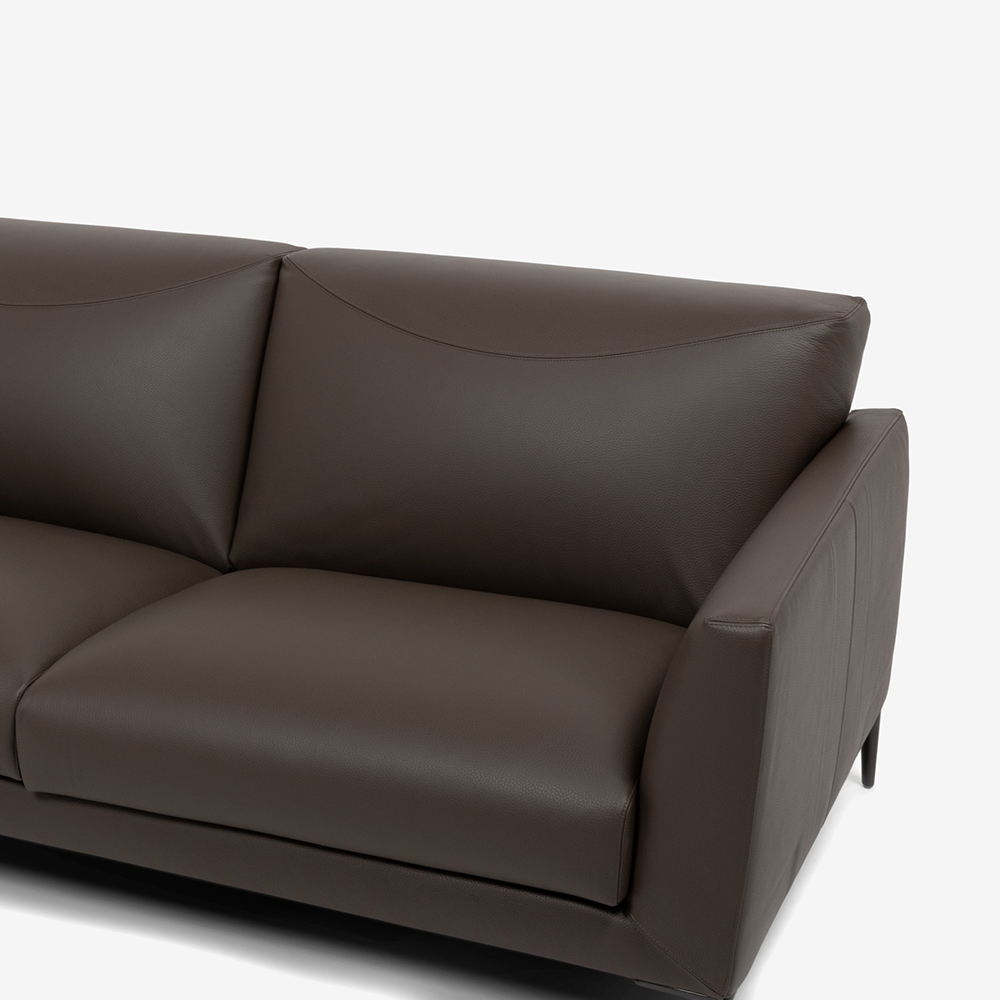 細身のフレームデザインは座面をひろく使うことができ、ゆったりとおくつろぎいただけます。フレーム一体型の背クッションには曲線のステッチが入っており、アクセントになっています。