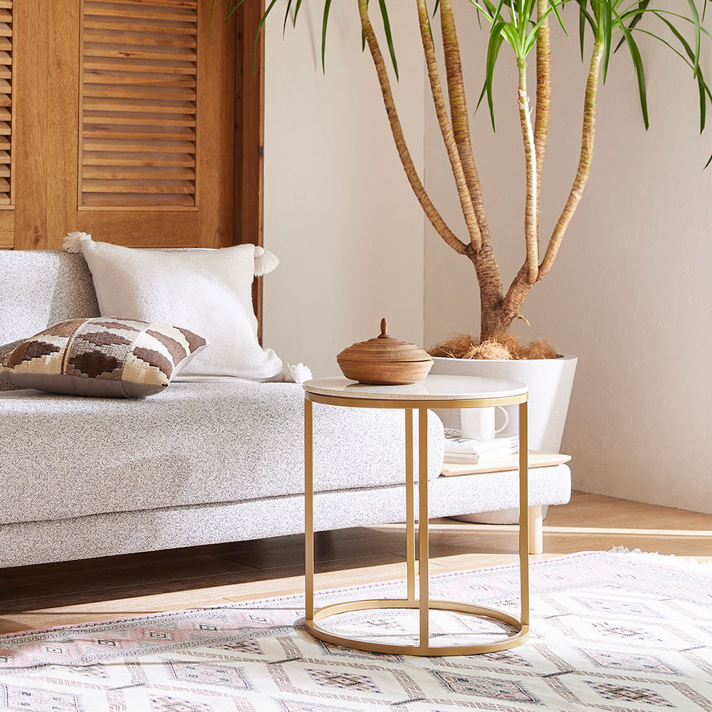 人気の高い天然石の天板と上品で落ち着いたトーンのゴールドフレームの組み合わせは、モダンなコーディネートに組み合わせるとやさしい雰囲気をプラスしてくれます。同系色のゴールドフレームを使ったテーブルスタンドを合わせて統一感をアップ。