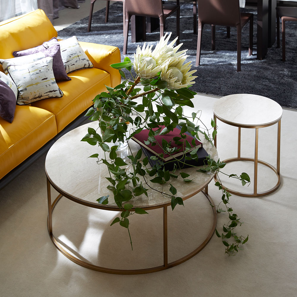 パステルカラーでまとめたリビングコーディネートにエレガントな華やかさを添える天然石のセンターテーブル。センターテーブルの脚部は光沢を抑えたゴールド色なので、カジュアルなアイテムともコーディネートしやすいデザインです。