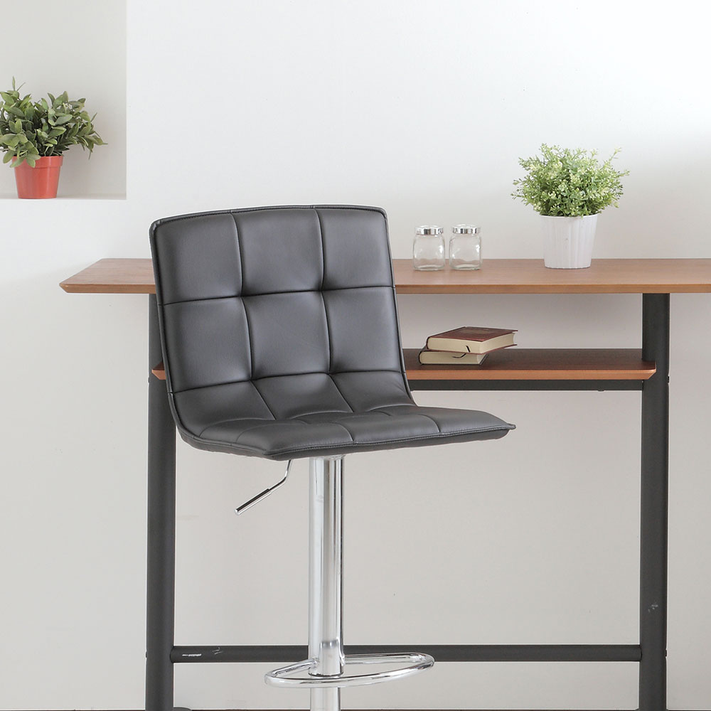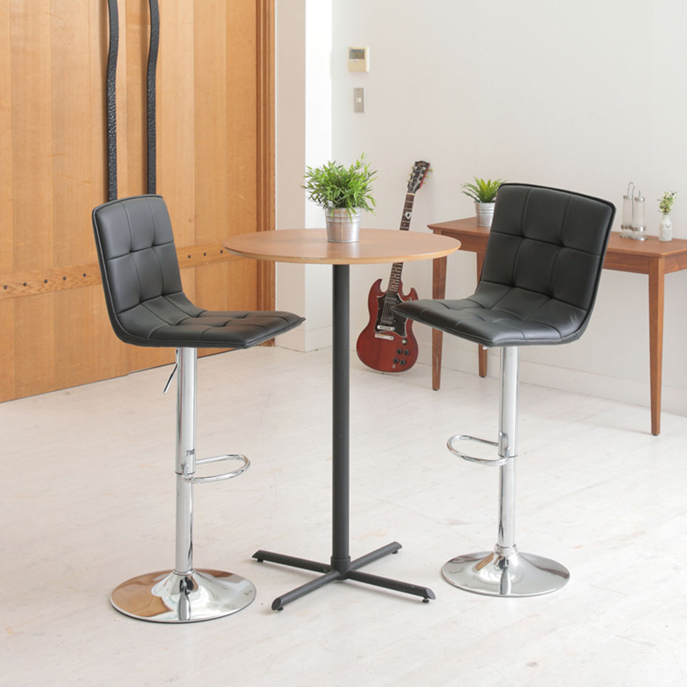 レバーの操作で座面高を60cm〜81.5cmに調整することができ、フットレストも連動して昇降します。座面は飲み物をこぼしてもさっと拭き取ることができる合成皮革張りです。