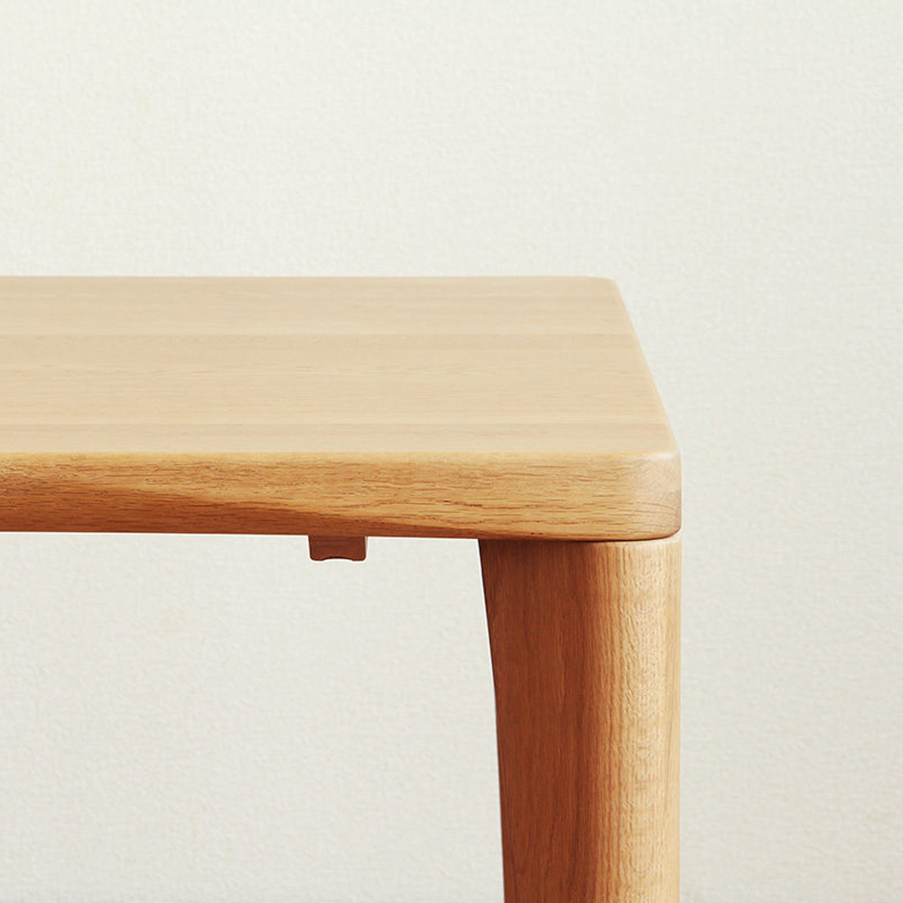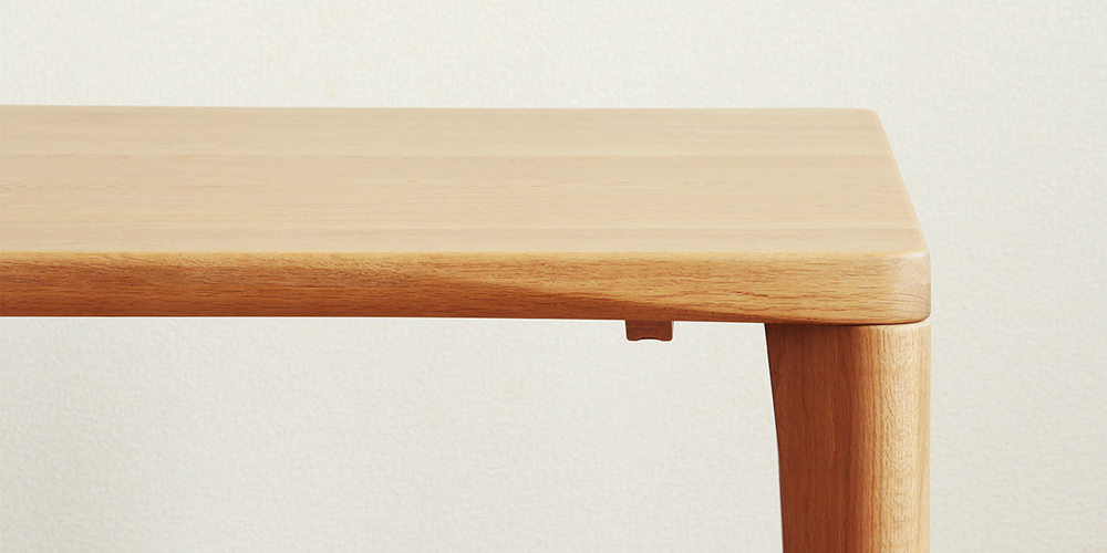 42mmの天板を重厚感を損なうことなく、大胆に削ることによって圧迫感を軽減しました。また、削ることによって太ももが当たりにくく、出入りしやすくなっています。天板はキズや汚れに強いUV塗装を施しています。硬度が高く、天板の美しさ、強さを維持します。