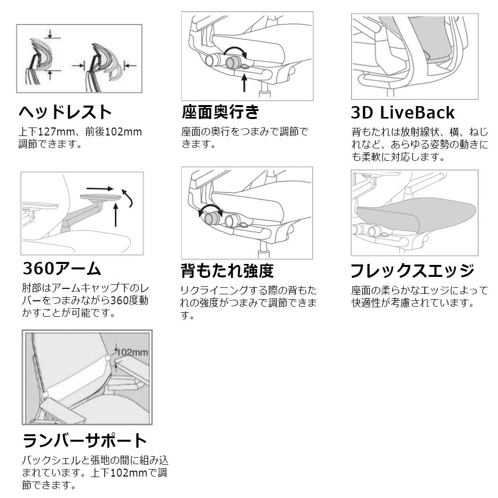 背もたれは放射線状、横、ねじれなどあらゆる姿勢の動きにも柔軟に対応します。
