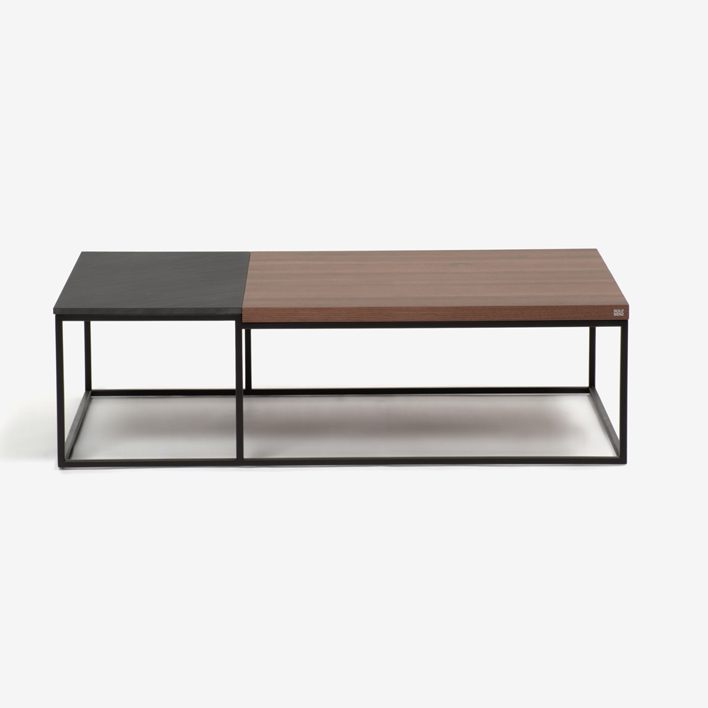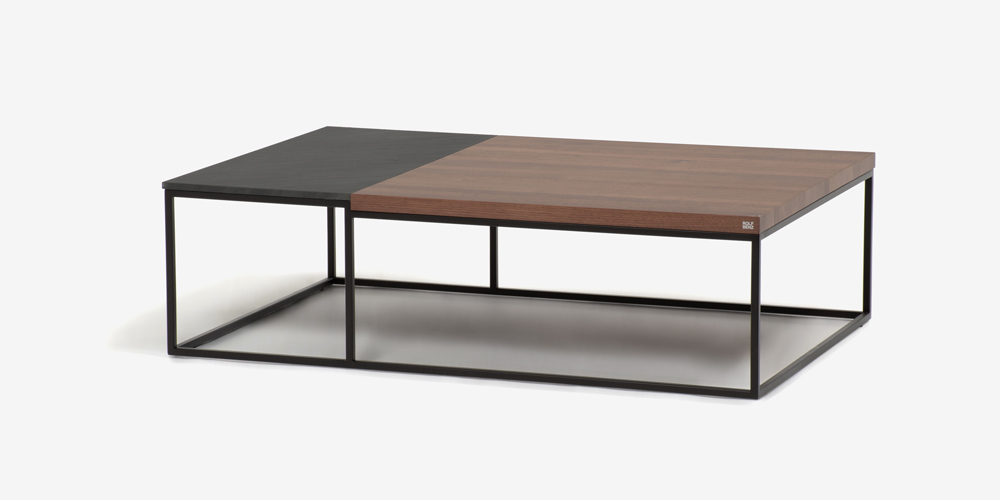 アメリカンウォールナット材と天然石 slate(粘板岩)の天板と金属脚の3つの異素材を組み合わせたリビングテーブル。