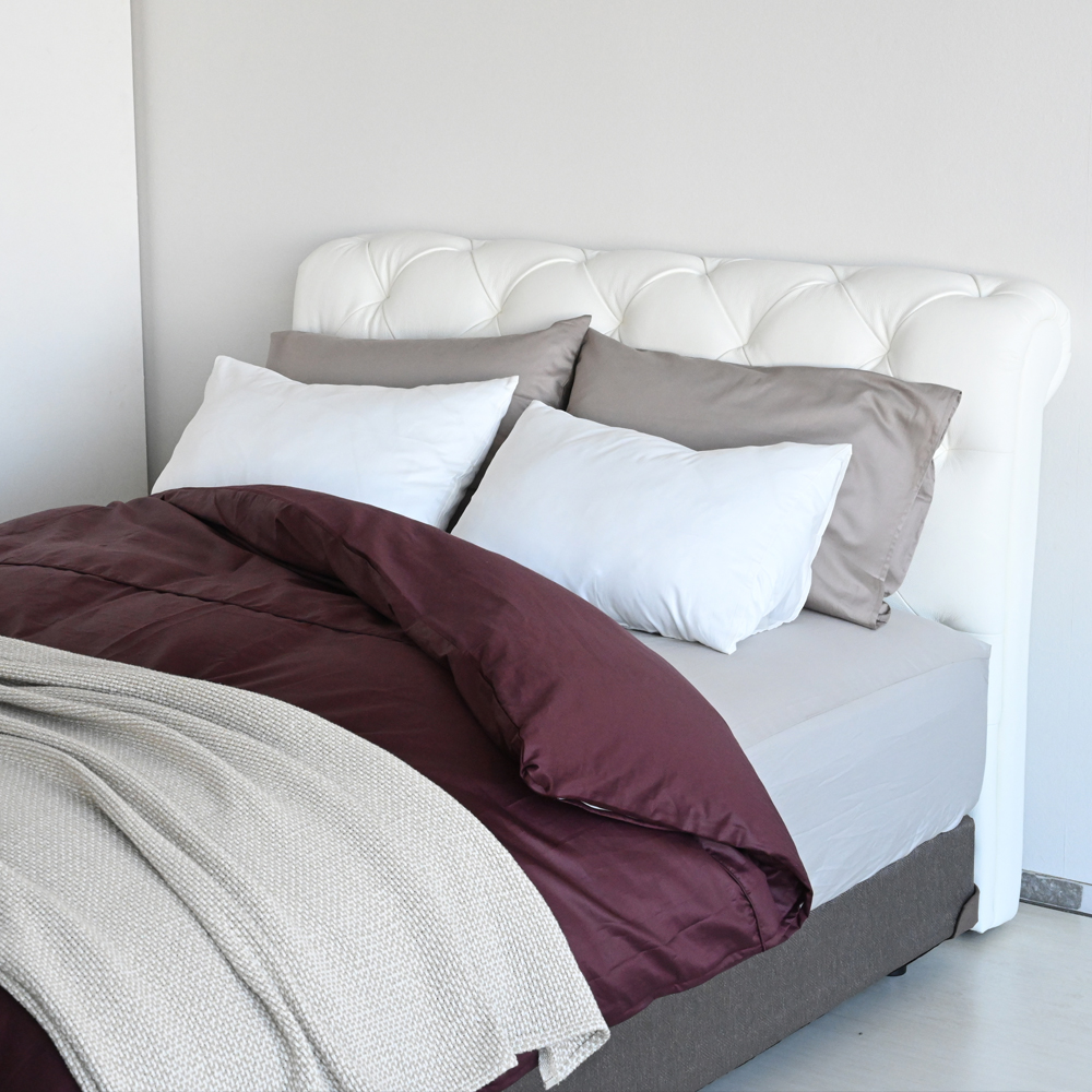 しなやかな60番手の綿を使用したサテン織のカバーリングシリーズです。シリーズ内でカラーコーディネートを楽しめる5色展開となります。※画像はコーディネートイメージです。まくらカバー(カーキ・ホワイト)、掛け布団カバー(カーキ)、ボックスシーツ(ライトグレー)を使用しています。