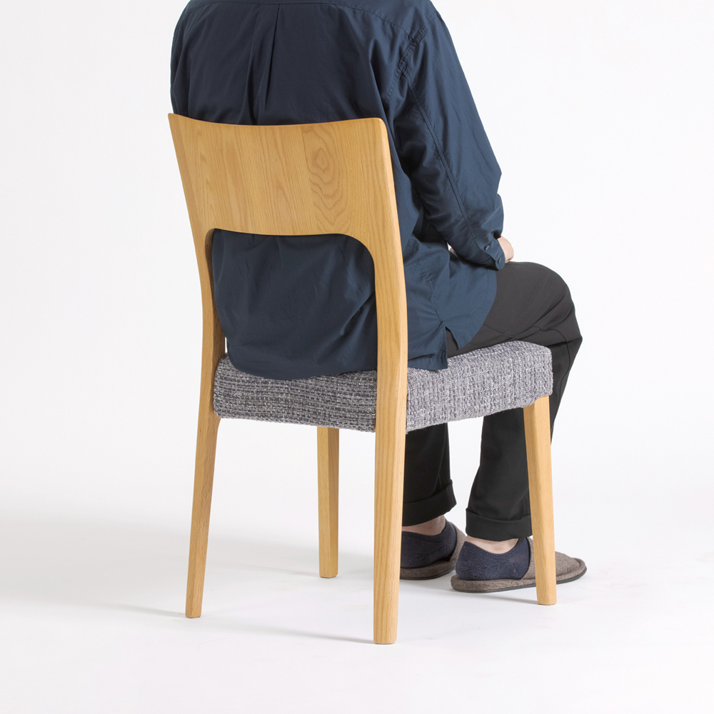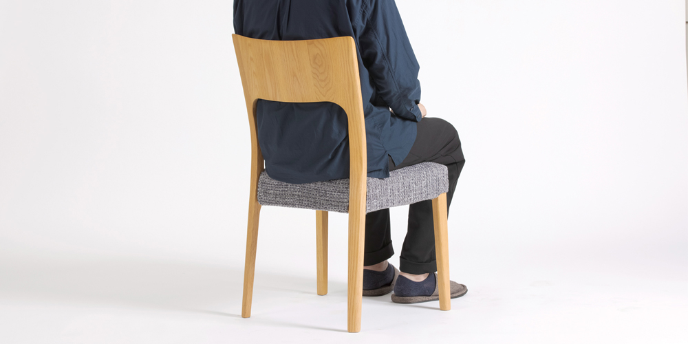 背中にピタッとあたる背もたれはR350曲木を使い、メッシュウェビングを使った座面で底付感のない座り心地と扱いやすい軽さに仕上げています。座面はカバーリング仕様となっており、取り外してお手入れをすることもできます。