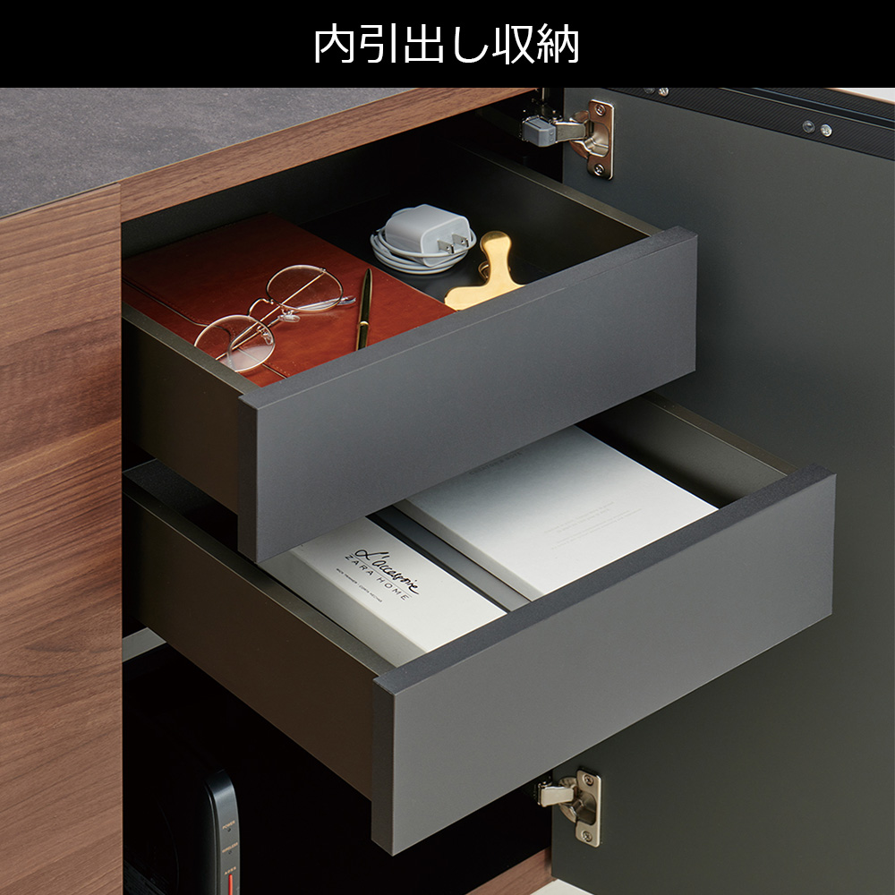 収納部は可動棚と内引出しが設けられており、大きなものから細かなものまで効率よく収納できます。可動棚板(大2枚、小2枚)付きで収納物にあわせて棚板の位置を調整できます。