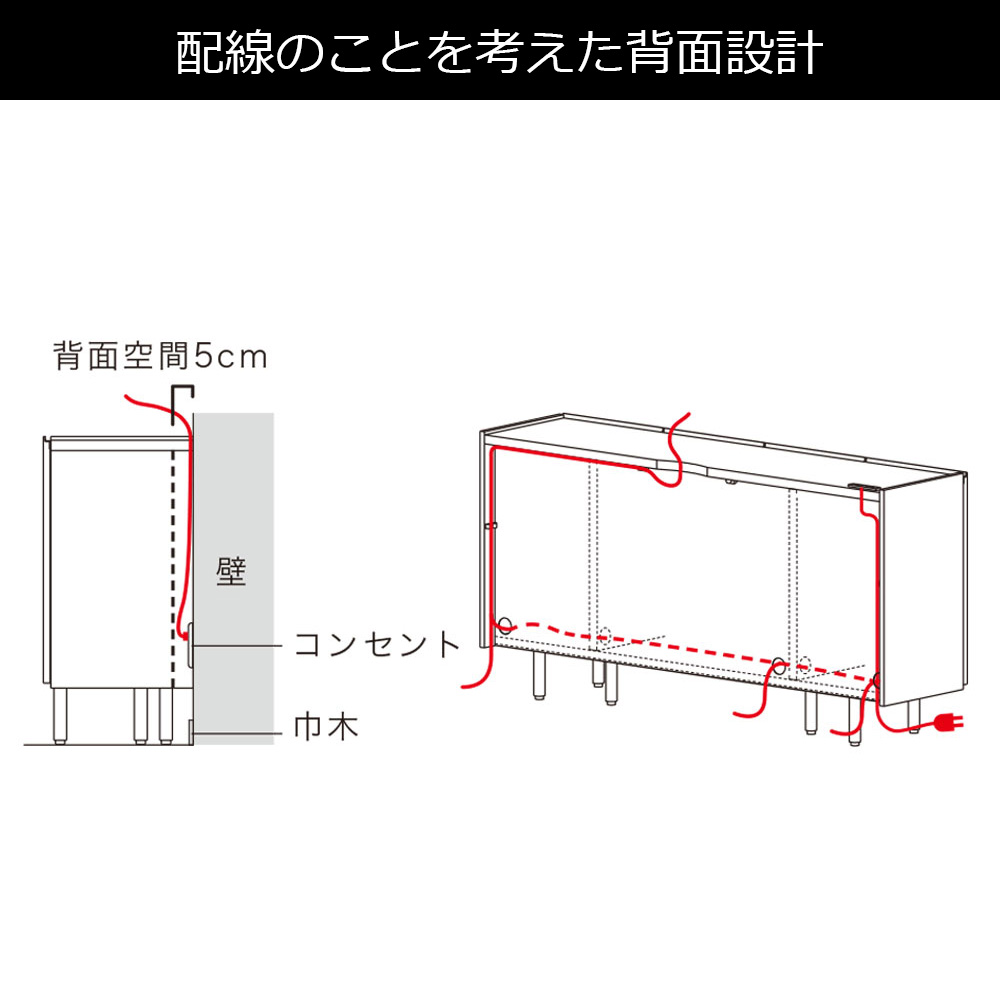背面には配線用に5cmの空間が設けられているので壁にぴったり設置できます。仕切りにも配線孔が設けられており、内部での配線も可能です。