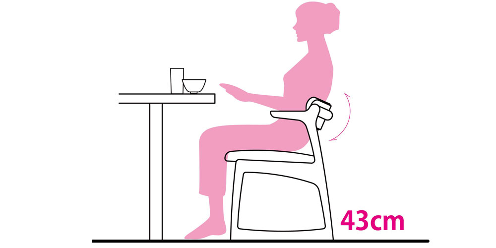 身体(胸郭)を「のせる」背もたれは姿勢になじみ、姿勢の変化にも対応できるよう回転構造になっています。キャスパーアプローチにより、自然な骨格ラインとなり、不要な力が抜けることで今までにないリラックスが得られます。また、適切な位置のひじ掛けが立ち座りをアシストします。