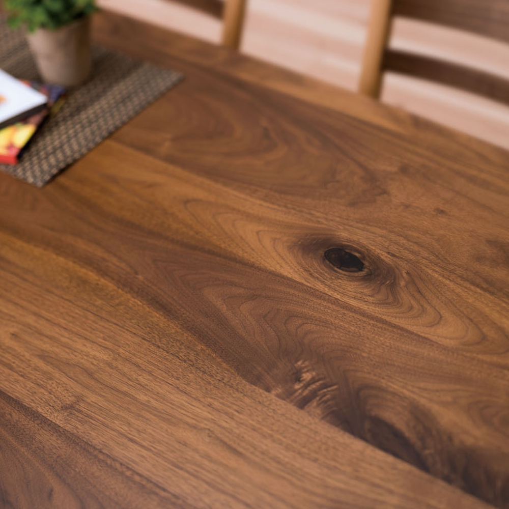 天板は天然木の味わいを十分に楽しめる「波面型」の仕上げがされています。※画像は4本脚タイプのものです。
