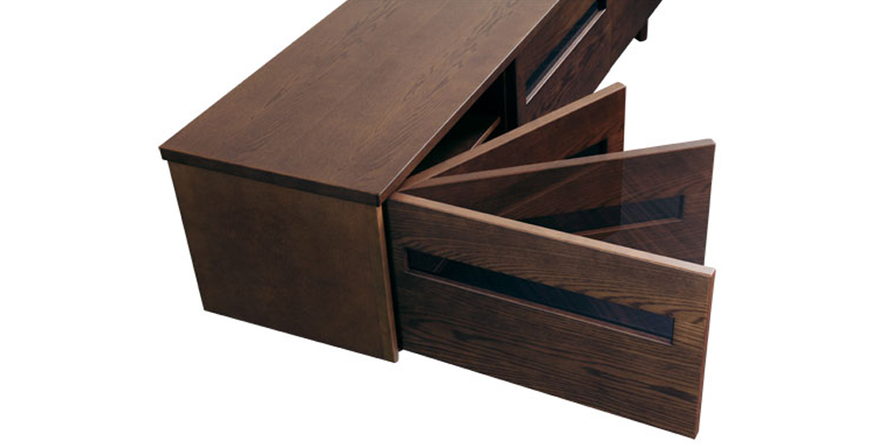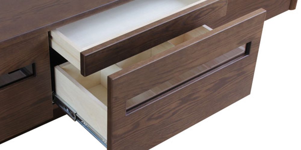 収納・仕分けを考慮した、大・小二つの引き出付きです。下の引出にはスライドレールを採用しているので、重量物を入れてもスムーズに可動し、奥の物も取り出しやすくなっています。※幅1300mmタイプは小引き出はありません。