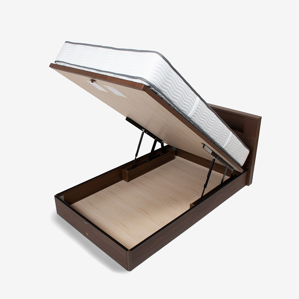 ガススプリングを使用した跳ね上げ式収納タイプで、ベッドフレーム全面を収納スペースとしてお使いいただけます。出し入れする頻度の少ない季節ものなどの収納におすすめです。