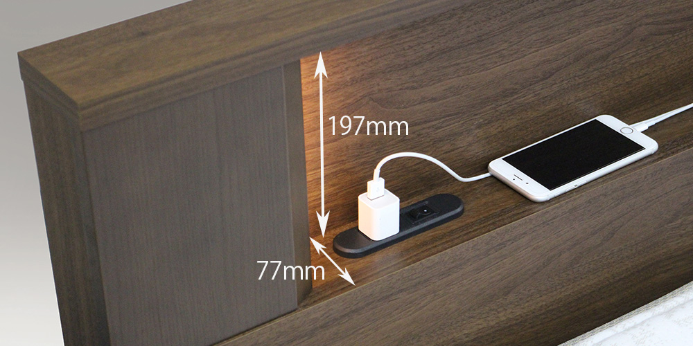 奥行き7.7cmのスリムシェルフ付きでスマートフォンやメガネなど、枕元に必要なものをまとめておくことができます。照明スイッチと充電に便利な1口コンセント付きです。