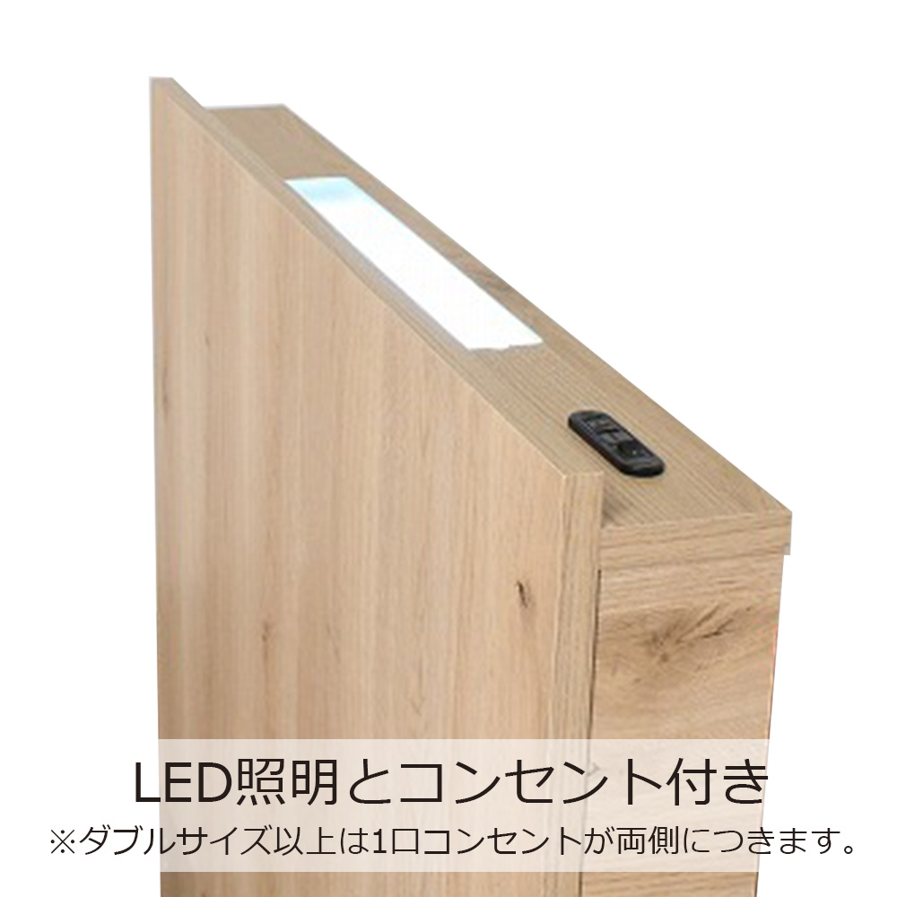 天然木の風合いを再現した木目調シートを縦横に貼り分けた市松模様が印象的なデザインのヘッドボードです。すっきりした見た目ながら、上部にはLED照明とコンセント付きでベッド回りに必要な機能も備えています。※画像はダブルサイズです。