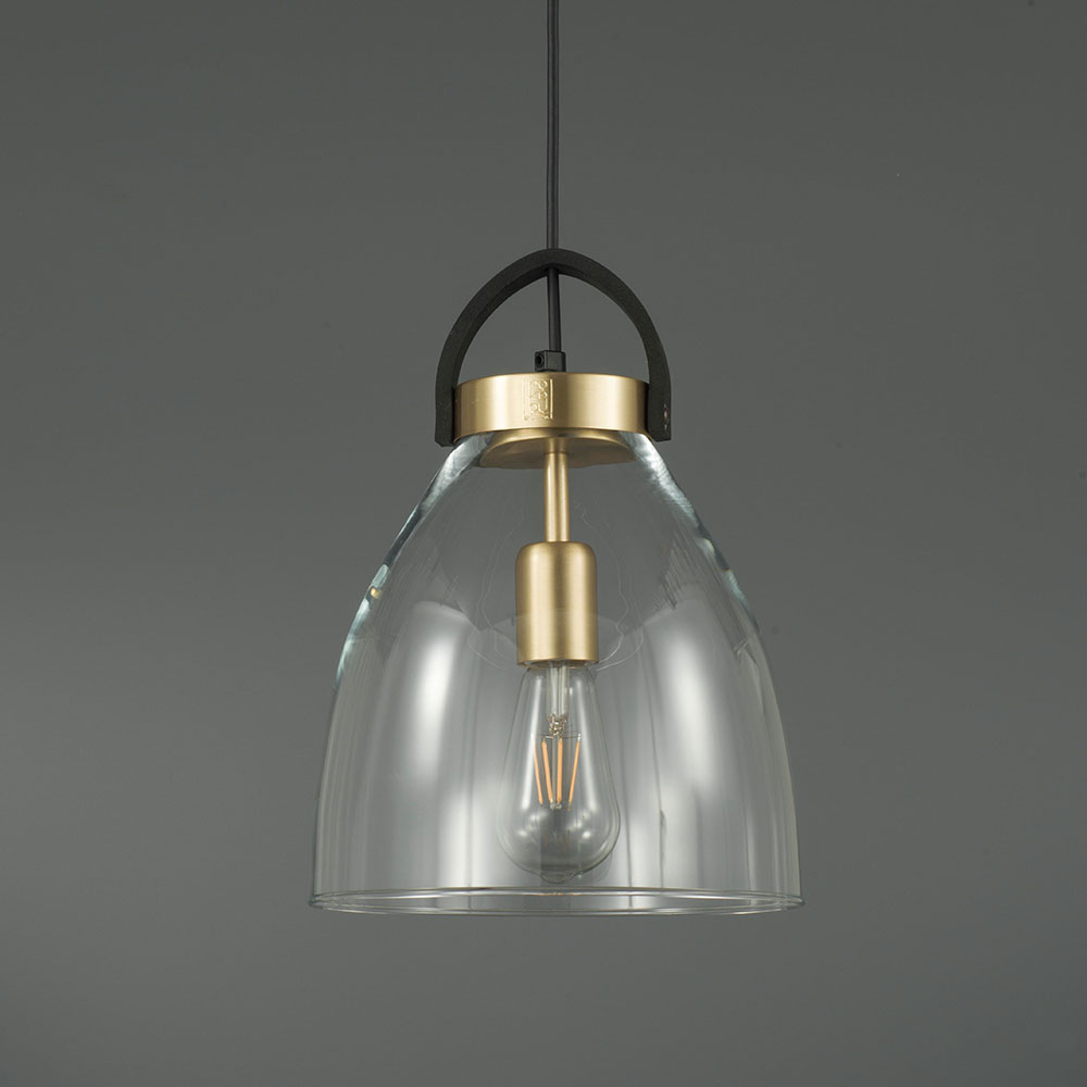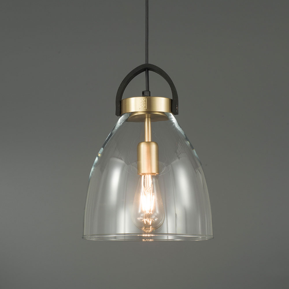 バルセロナのFPKOBU社製のペンダント。クリアガラスにソケット部分の真鍮色フレームと上部のネオプレン素材のバンドが個性的なデザインです。コード収納フレンジ付きですので、好みの高さに調節ができます。簡単に取り付けができる引掛けシーリング取付です。