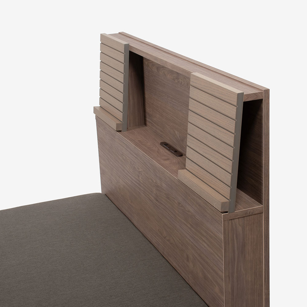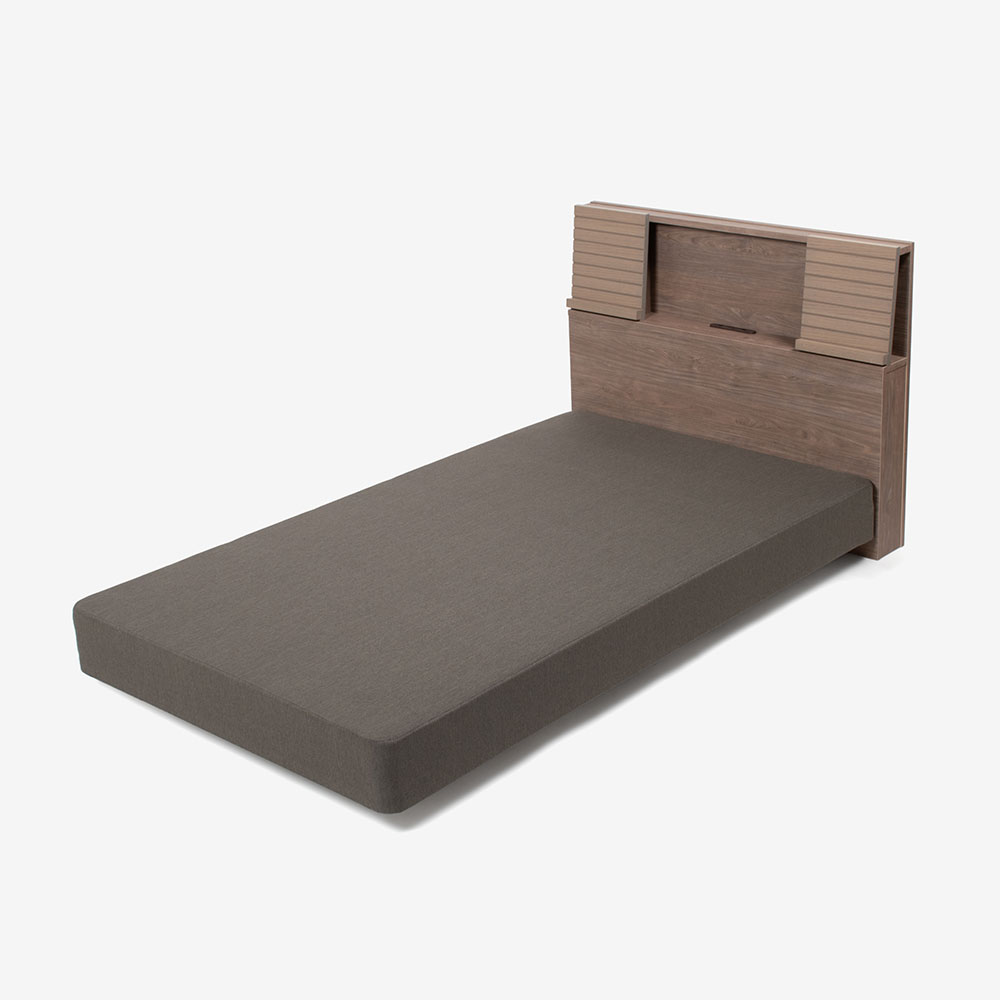 シンプルなデザインの中でさまざまなバリエーションから選べるオラールシリーズ。本やタブレットなども置くことが出来るキャビネット付きのヘッドボードデザインです。ヘッドボード側面がフラットなデザインなので2台並べてのレイアウトも可能です。※マットレスは別売りです。画像はグレージュ色のセミダブルサイズです。