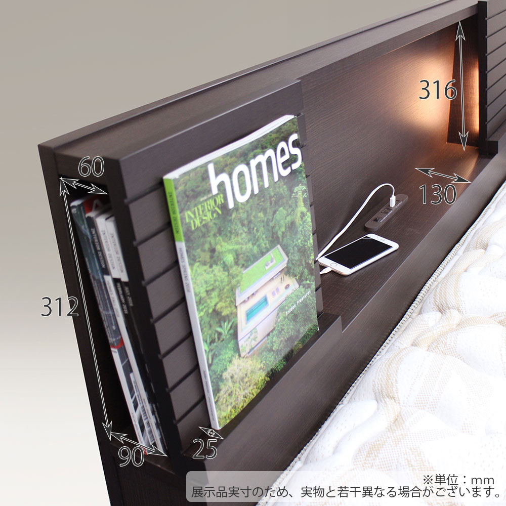 スマートフォンやメガネなど、枕元に必要なものをまとめておくことができる棚とLED照明付きです。サイドにも棚があり、本などをスマートに収納できます。ヘッドボード中央にはLED照明のスイッチと充電に便利なコンセントとUSBポートが1口づつ付いています。※画像はダーク色を使用したイメージです。