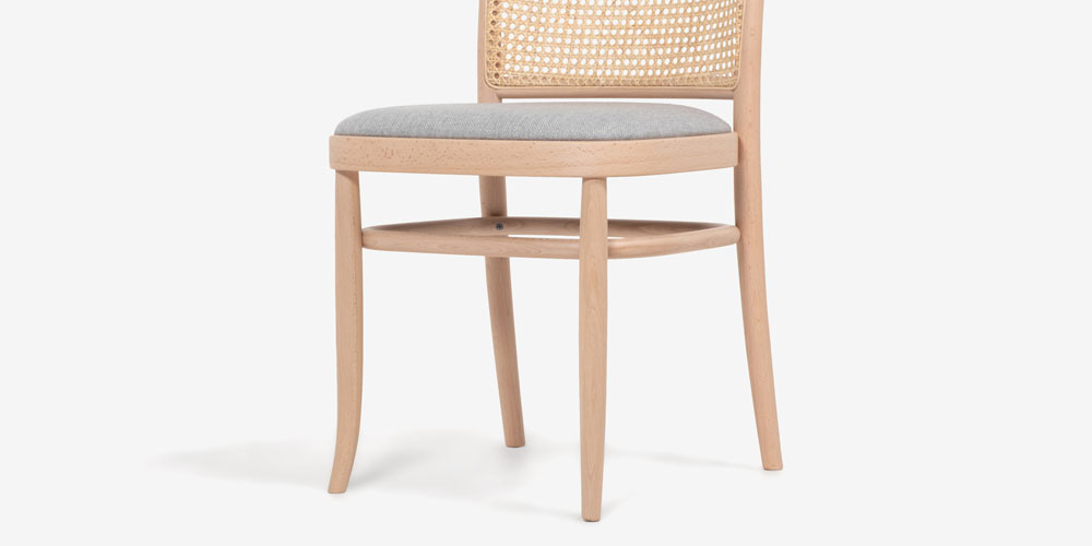 曲木特有の流れるような優雅なラインと、心地よい座り心地のために計算し尽された、職人の技術が光るチェアです。籐張りの背もたれは通気性に優れ、軽やかな印象。背面から見ても曲木家具ならではの美しさを楽しむことができます。