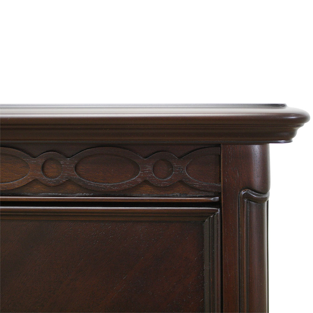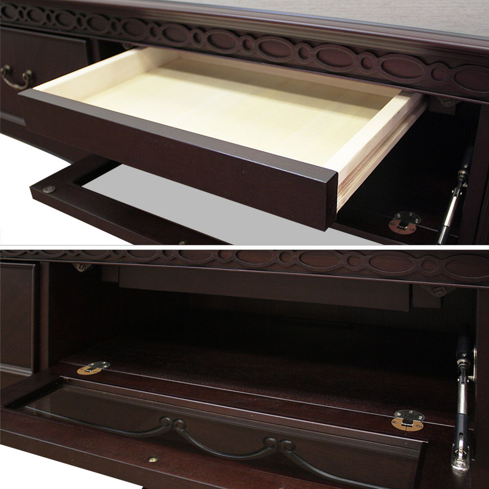 マホガニー材を贅沢に使い、表面は厳選された木目を使った化粧張りを施し、フレンチエレガンスの代名詞といえる「カブリオールレッグ」(猫脚)と、なめらかな女性的な美しいラインとマホガニー無垢材を削り出した彫刻が特徴です。 ゆるやかにカーブした柔らかなラインとカブリオールレッグ(猫脚)と彫刻が上品な雰囲気と可愛らしさを際立たせています。