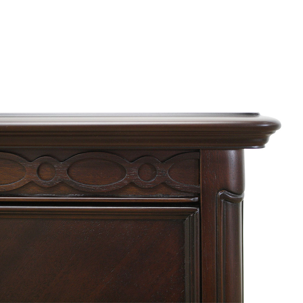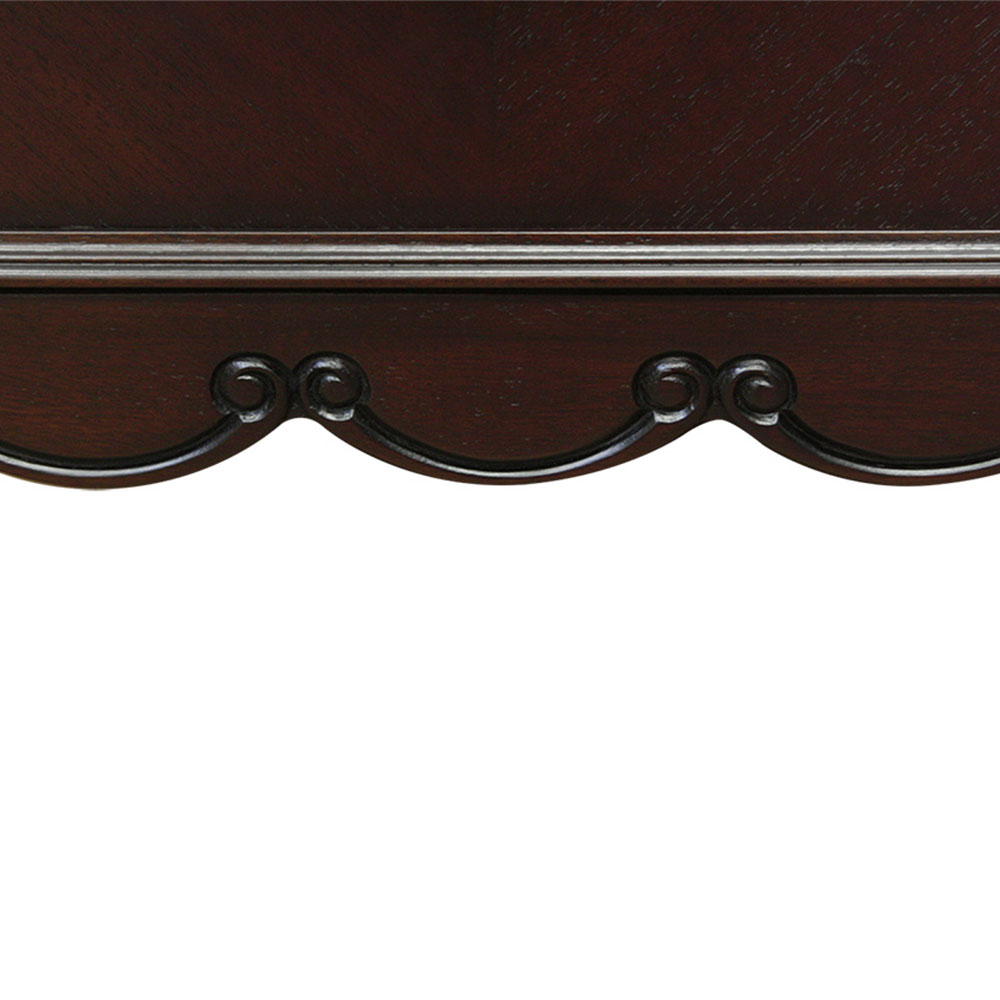 マホガニー材を贅沢に使い、表面は厳選された木目を使った化粧張りを施し、フレンチエレガンスの代名詞といえる「カブリオールレッグ」(猫脚)と、なめらかな女性的な美しいラインとマホガニー無垢材を削り出した彫刻が特徴です。 ゆるやかにカーブした柔らかなラインとカブリオールレッグ(猫脚)と彫刻が上品な雰囲気と可愛らしさを際立たせています。