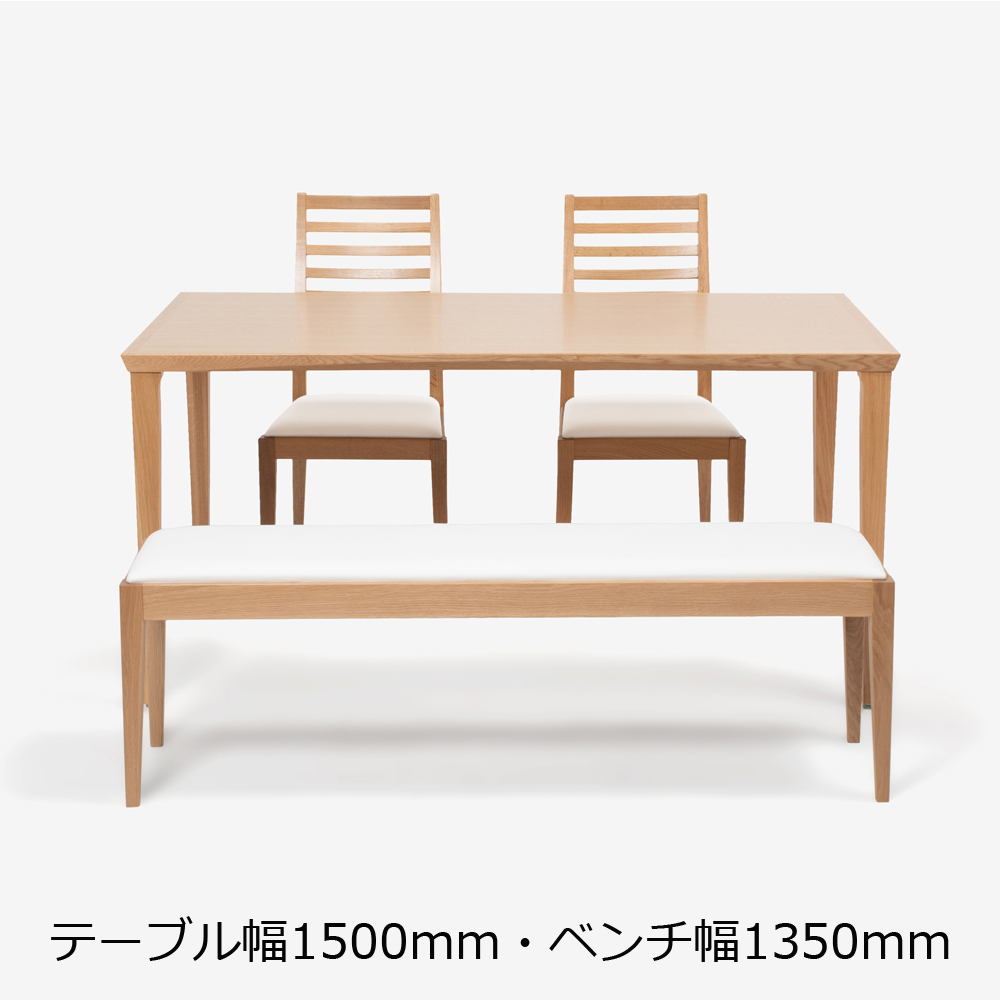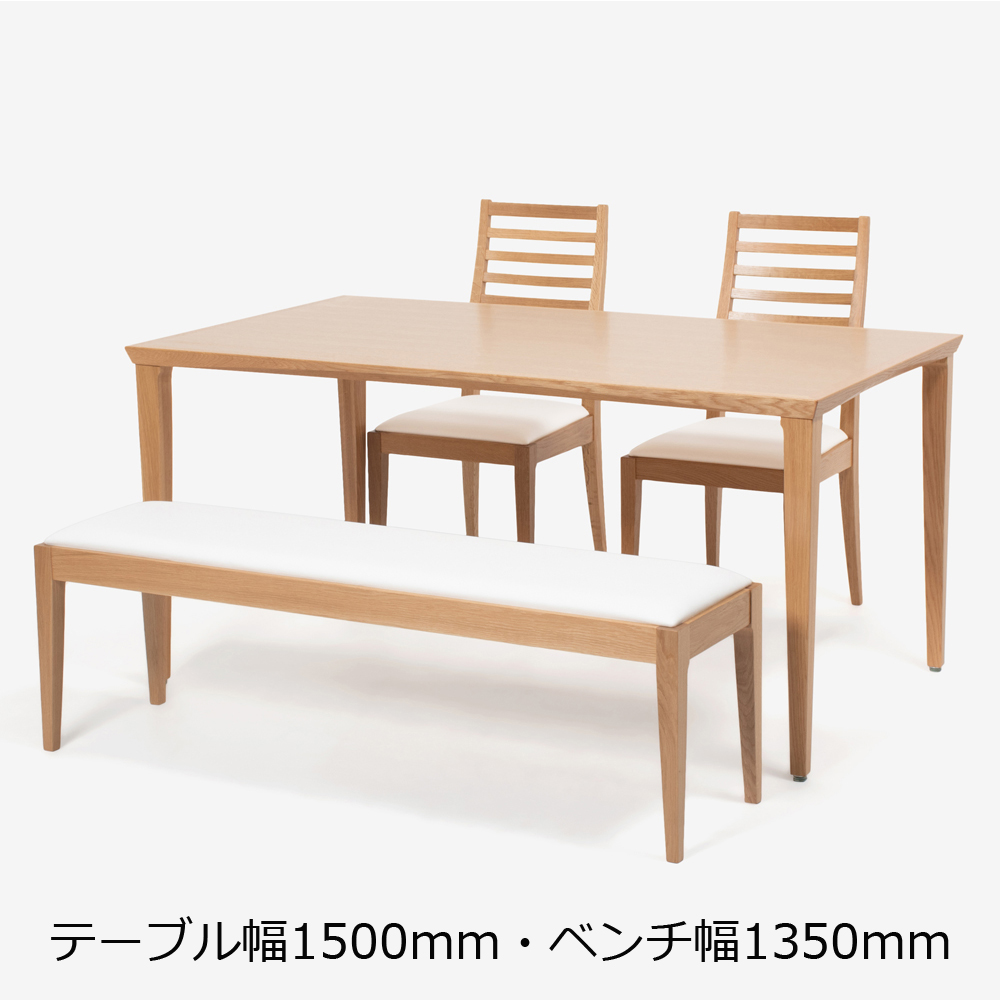 画像はベンチ幅1350mmと、同シリーズのダイニングテーブル幅1500mm・ダイニングチェアを合わせたイメージです。