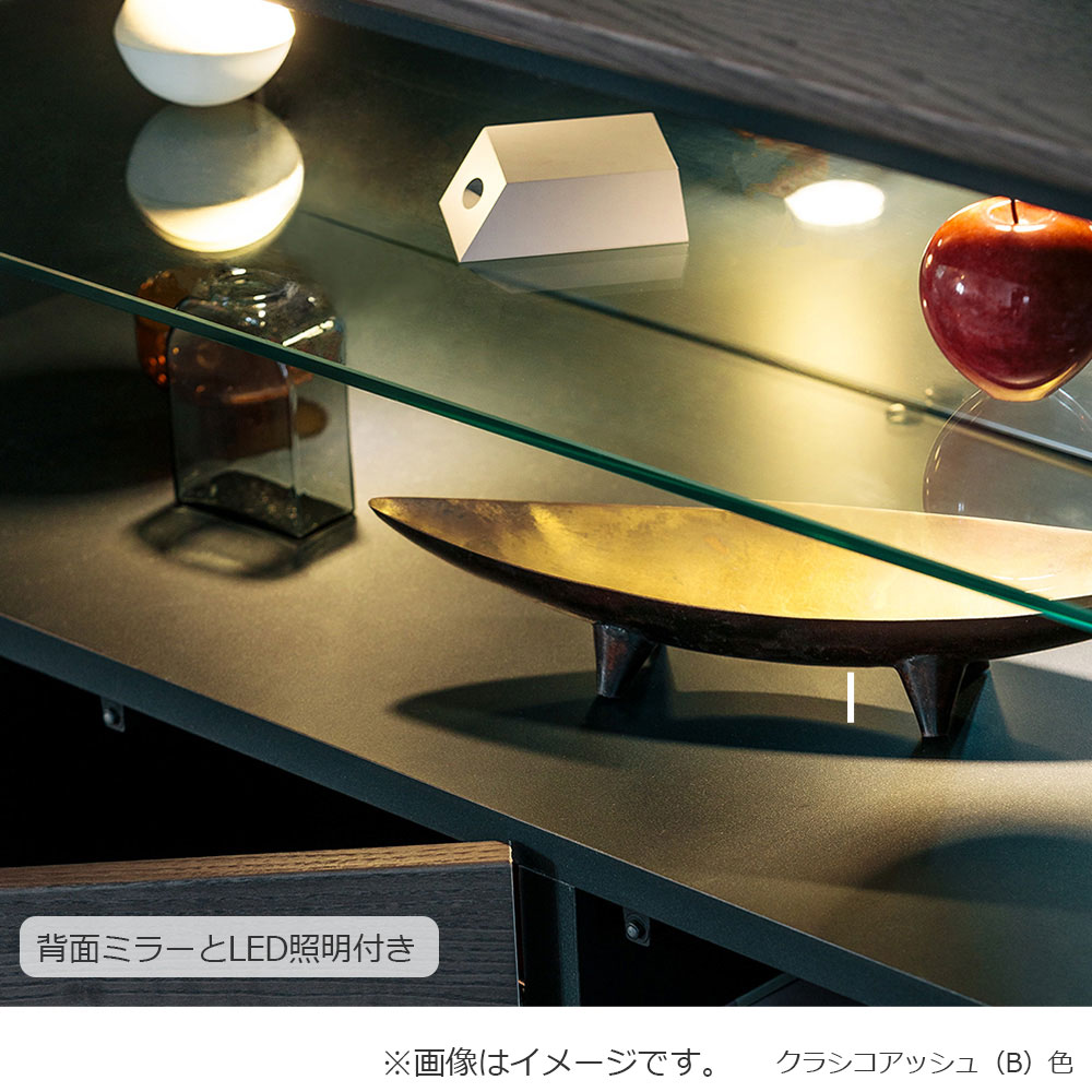 パーツのひとつひとつが細部までこだわって設計されており、使いやすい機能性と洗練されたデザインを兼ね備えたリビングボードシリーズです。背面ミラーのガラスオープン棚と開き戸収納を備えており、魅せる収納と隠す収納を兼ね備えたサイドボードです。