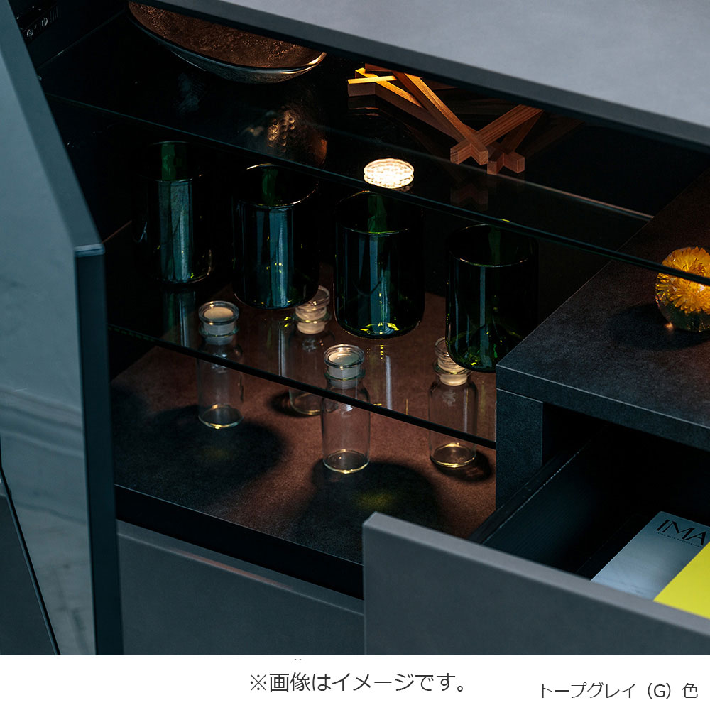 ディスプレイしたアイテムをLED照明で照らすことができ、お気に入りのアイテムを上品に演出します。引出し、開き戸ともにゆっくり静かに閉まるソフトクローズ仕様で、収納している物にも優しい設計です。