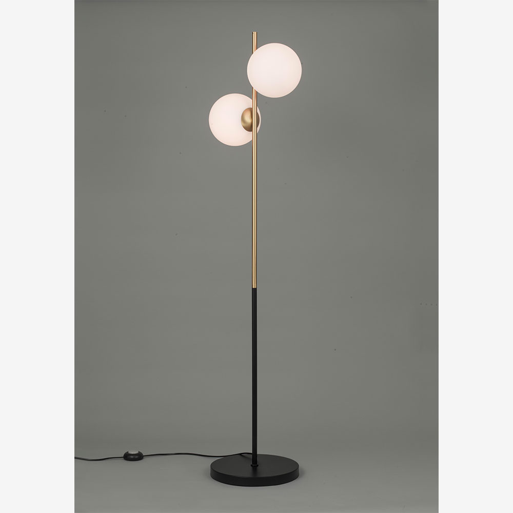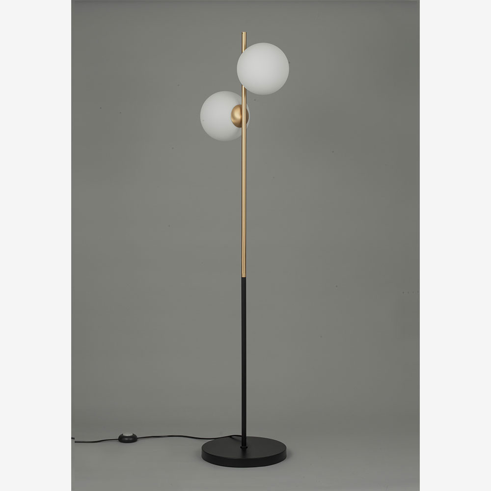 トレンドの真鍮色と球体ガラスを組み合わせたスタンドライトです。フロストガラスが光をやさしく拡散し、穏やかなくつろぎのある空間を演出します。お部屋の隅にレイアウトすれば素敵な間接照明をお楽しみいただけます。