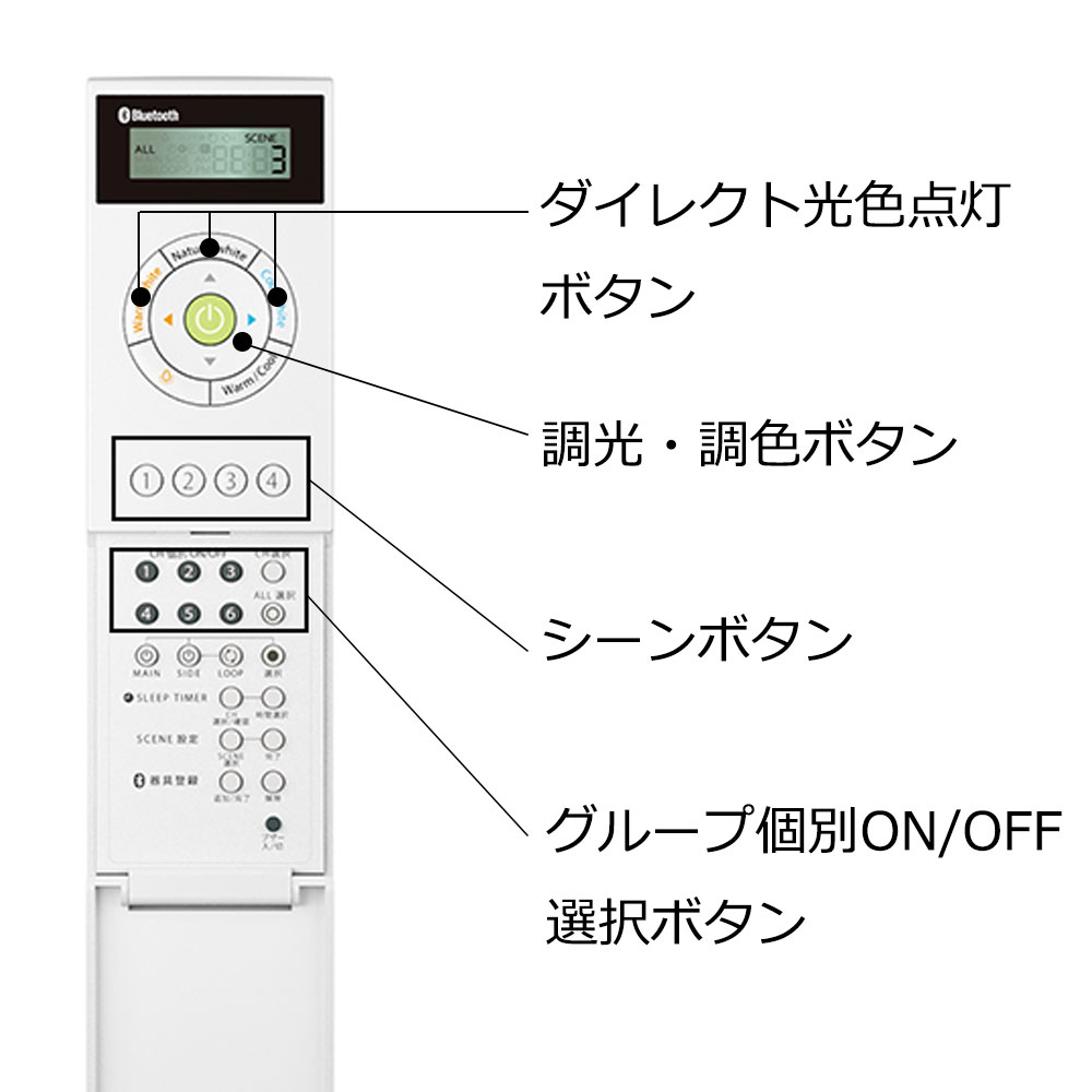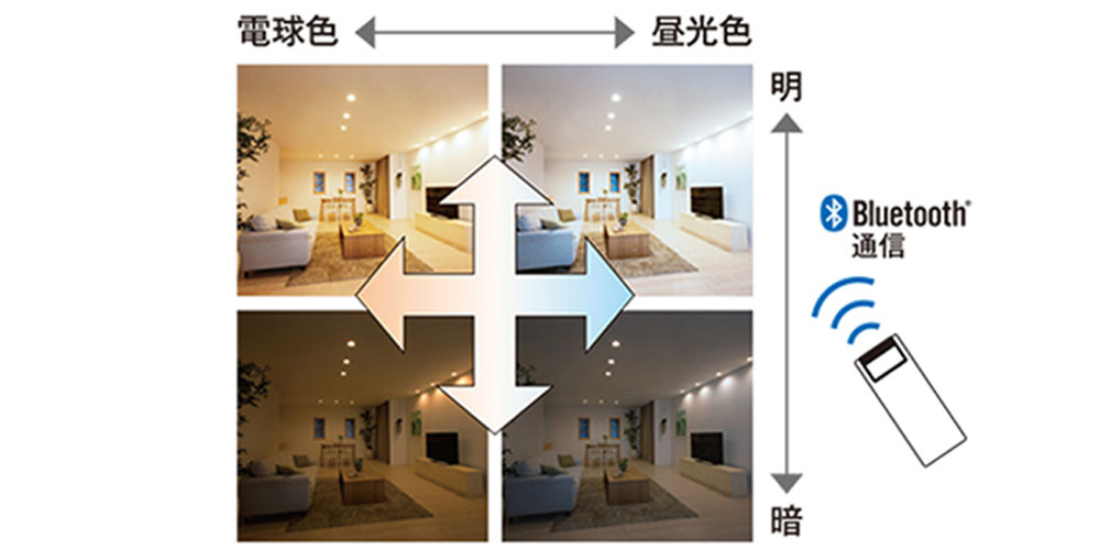 さわやかな光とくつろぎのあかり。生活シーンに合わせて、あかりの色と明るさを切り替えることができます。