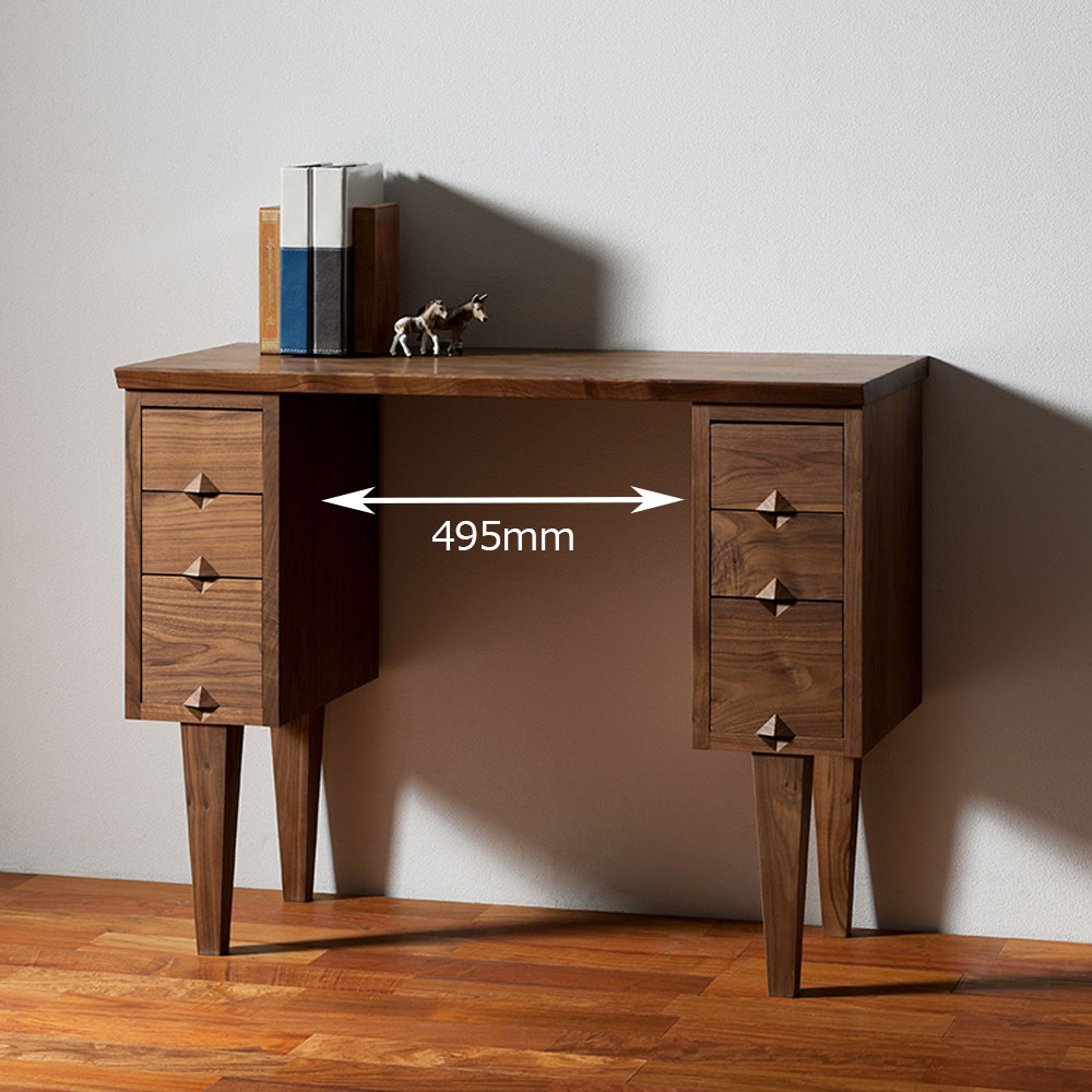 天板や前板にウォールナット無垢材を使用しており、美しい天然木の風合いを感じられるデスクです。左右に引出しを備えており、細かなものを分類して収納することが出来ます。奥行き40cmとコンパクトなサイズとインテリアにマッチするデザインでリビングや寝室にもおすすめなデスクです。