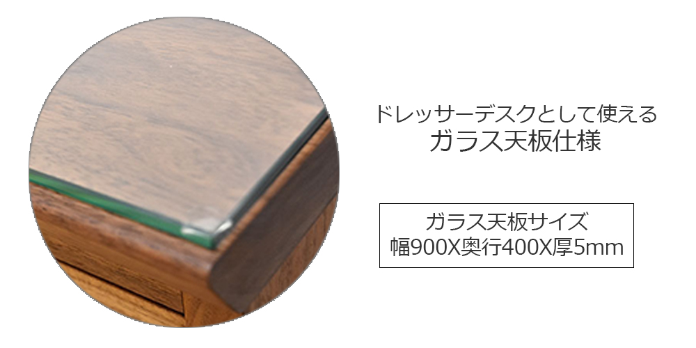 ガラス天板タイプは置き鏡をのせて、ドレッサーデスクとしてお使いただけます。2種類の深さのコンパクトな引出しはコスメの収納にも便利です。