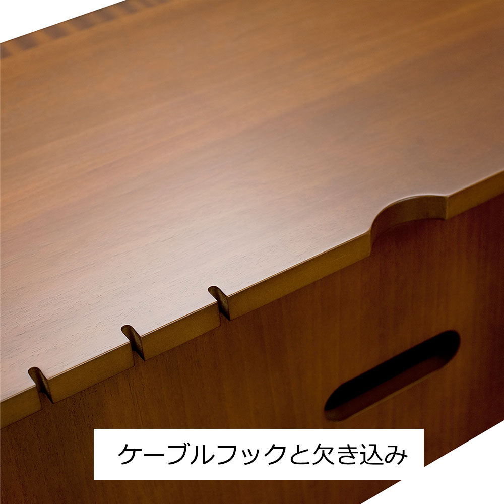 3か所のケーブルフックや配線孔。左右の側面にはクリップライト取付用の欠きこみを完備。パソコンデスクとしても使いやすい機能で、テレワークにもおすすめです。