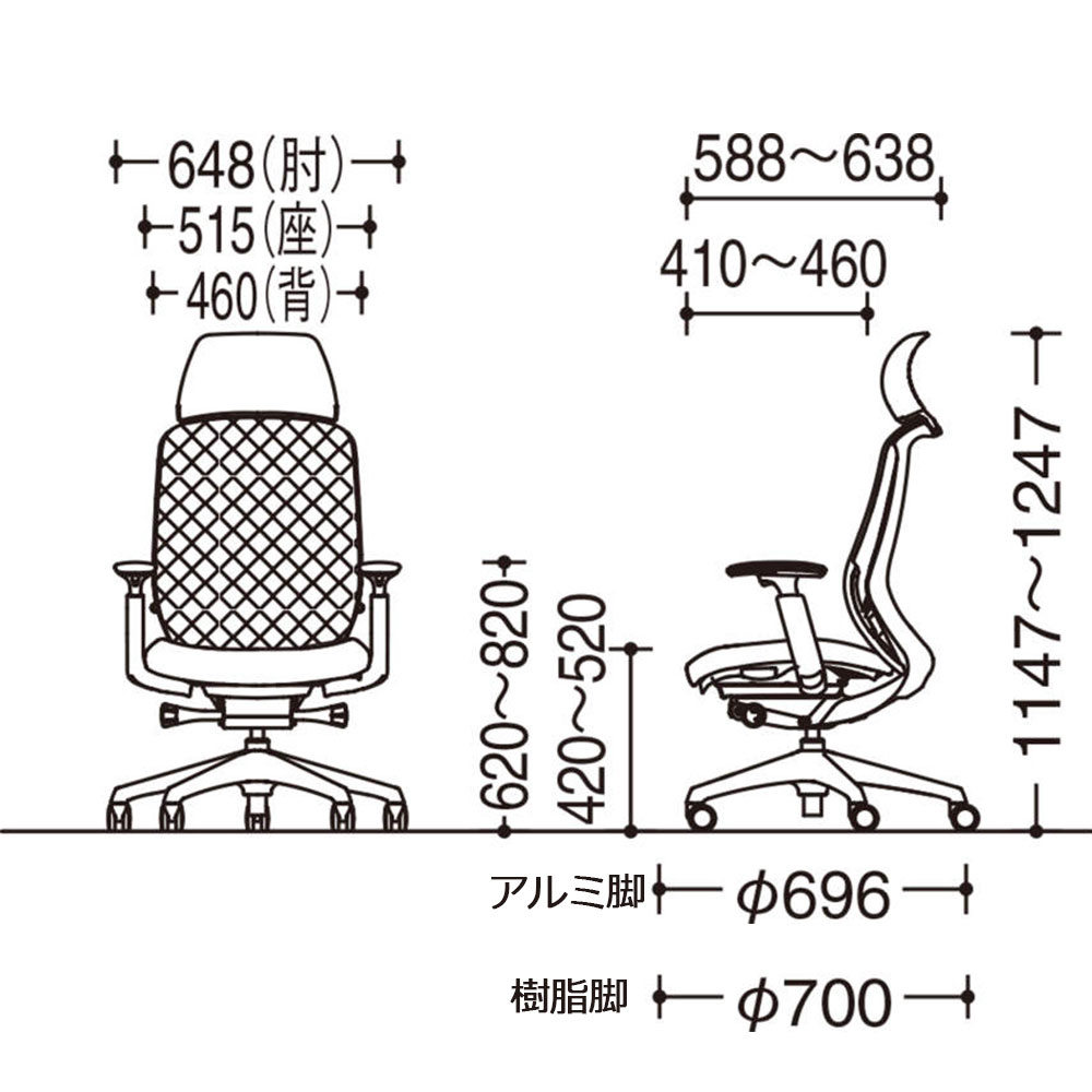 幅(肘含む)648x奥行588〜638x高さ(背)1147〜1247