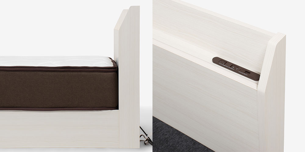 宮付きでありながらも薄手のヘッドボードは圧迫感がなく、お部屋の場所もとりません。コンセントとUSBポートはほこりの侵入を防ぐスライド式です。
