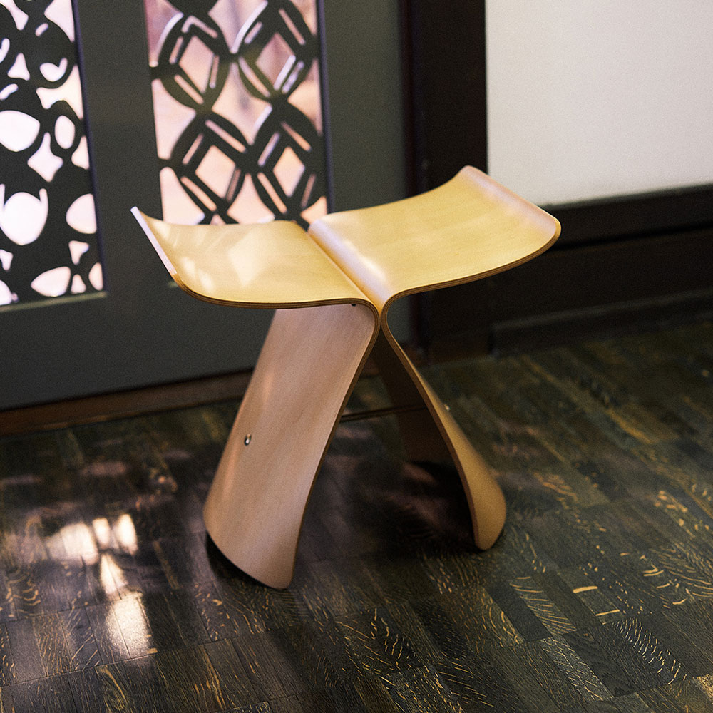 日本を代表するデザインとして、海外でも高く評価されているスツール。パリのルーブル美術館、ニューヨークの近代美術館など著名な美術館に収集されています。2枚の成形合板を組み合わせたシンプルな構造は、あたかも蝶が飛んでいるかのようなデザインで、このスツールの名前の由来にもなっています。