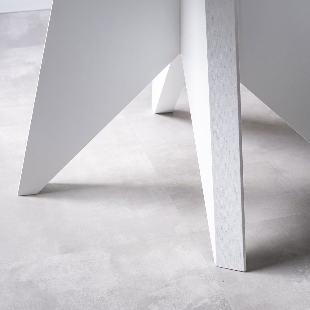ホワイトオーク木目の丸天板とエッジのきいた直線的な脚部との組み合わせが美しいモダンデザインのダイニングテーブルです。天板には直線的な木目が特長のホワイトオーク材柾目(突板)を使用し、幾何学的なヘリンボーン調に配置することで個性的な表情をつくっています。