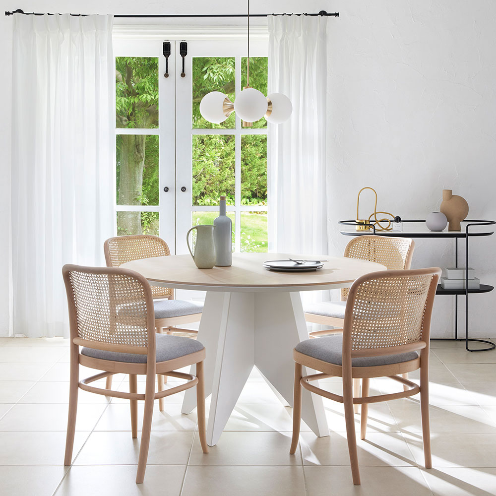 ホワイトオーク木目の丸天板がやさしい表情のダイニングテーブル