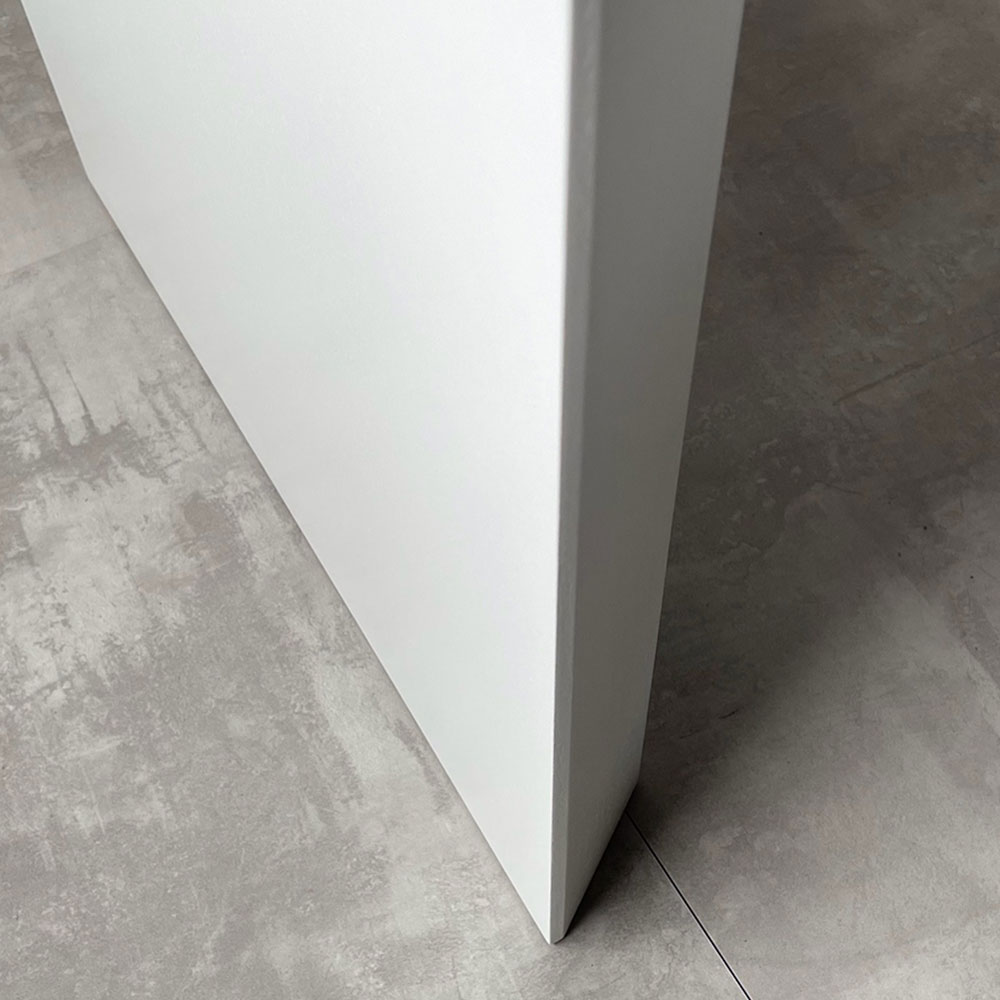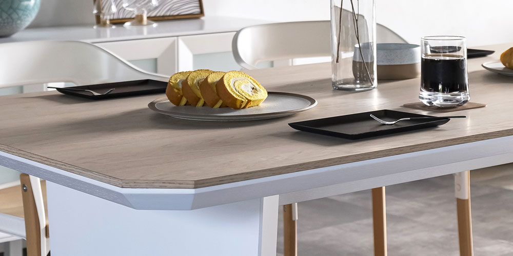 ホワイトとナチュラルのコントラストが美しく、優しい雰囲気です。テーブルエッジを斜めラインに仕上げ、馴染みやすさにもこだわった仕様です。