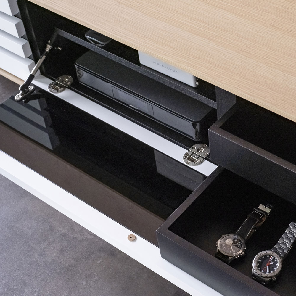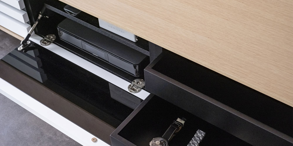 中央のフラップ扉にはAV機器収納と細かなものの収納に便利な浅い引出し2杯付きです。グレーガラスのスリットからリモコン操作が可能です。AV機器収納有効内寸:幅440X奥行340X高さ195mm(可動棚板付き)、引出し内寸:幅470X奥行315X高さ60mm