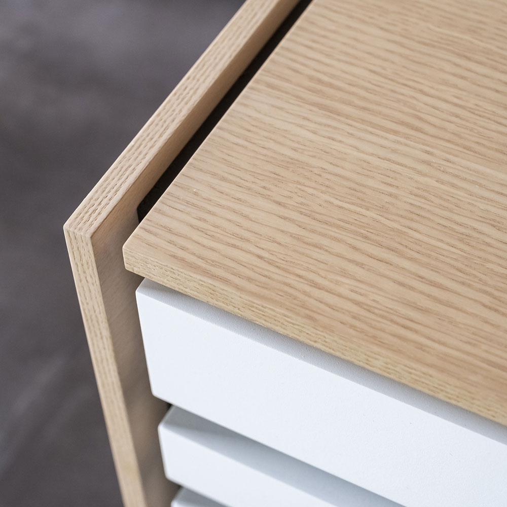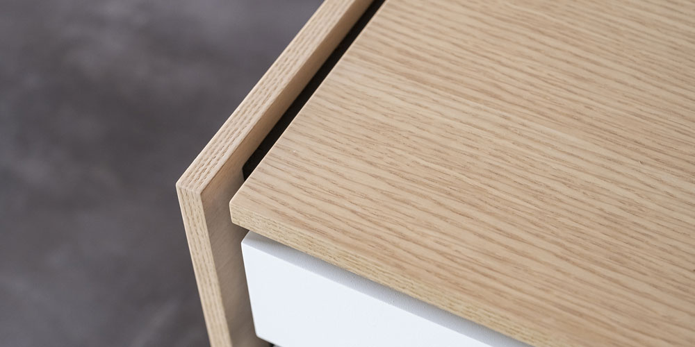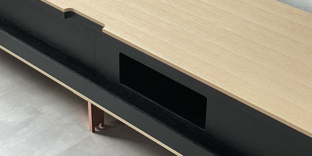 「ヨーロッパのモダンな家具にも合わせやすいジャパンメイドの家具が欲しい」という声をもとに生まれました。ミニマルなモダンテイストのデザインを基軸にし、直線と曲線の組み合わせ、木の美しさと温かみを大切に、美しさ・強さ・触れたときの感触にまでこだわって作り上げられています。