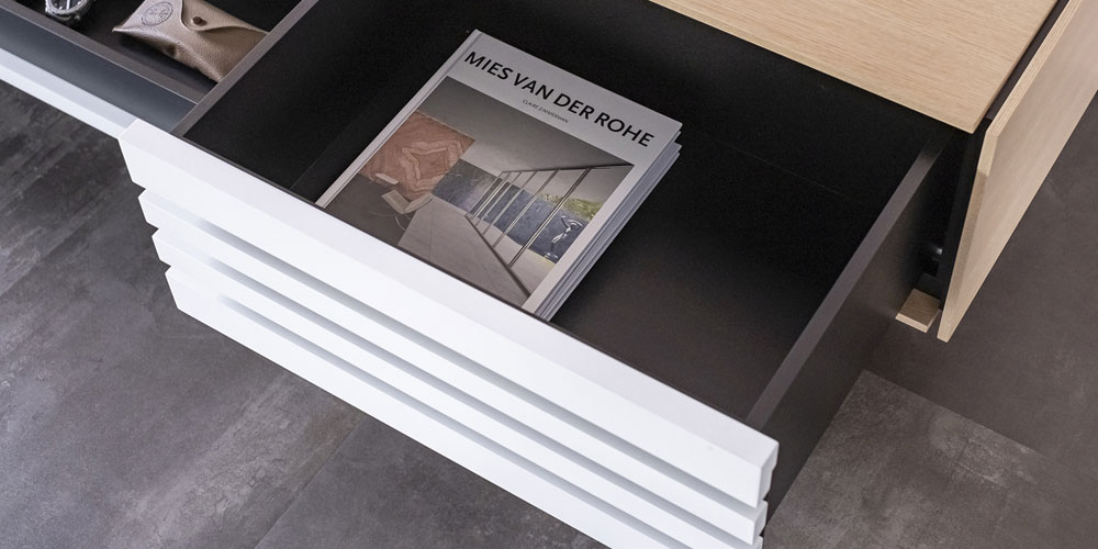 両サイドはプッシュ式の引出しで大容量の収納スペースになっています。引出し内寸:幅470X奥行330X高さ160mm