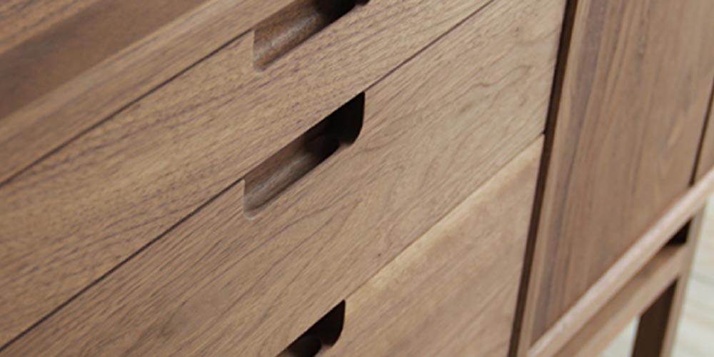 箪笥製造で培われた高度な木工技術(蟻組、雇い実、留め加工等)を注ぎ込んだリビングボード。引出しの中材には桐を使用し、高級箪笥のように、引出しを押し込むと他の段が出るほどの精密さです。