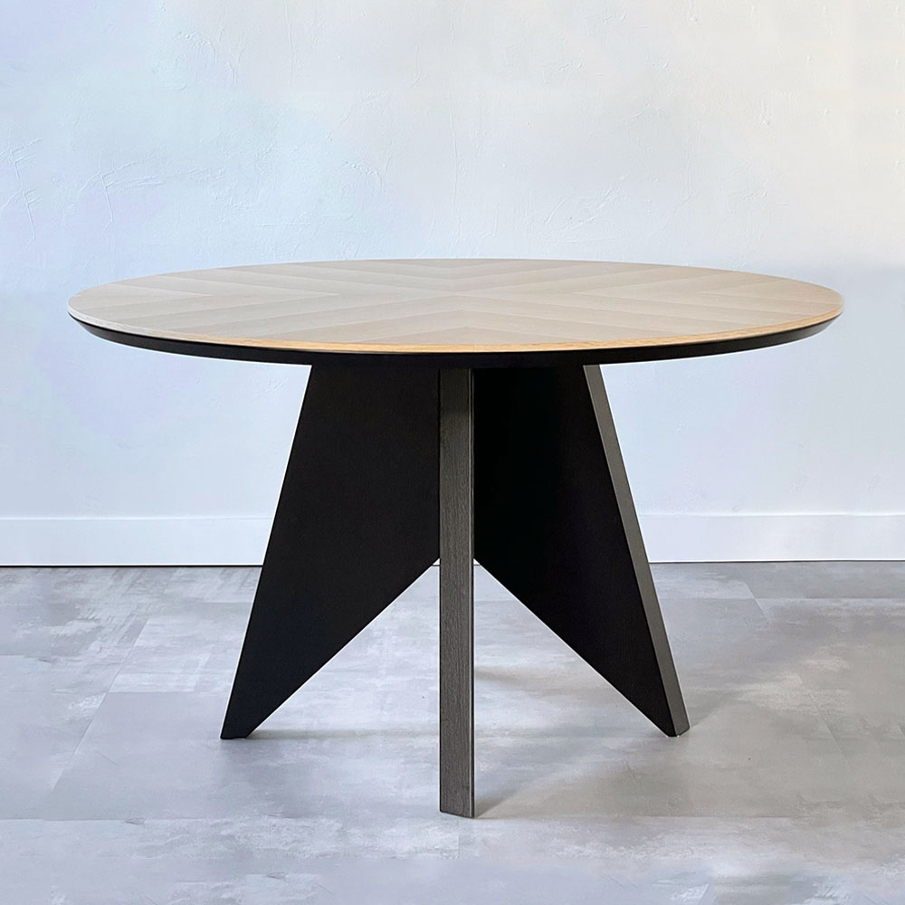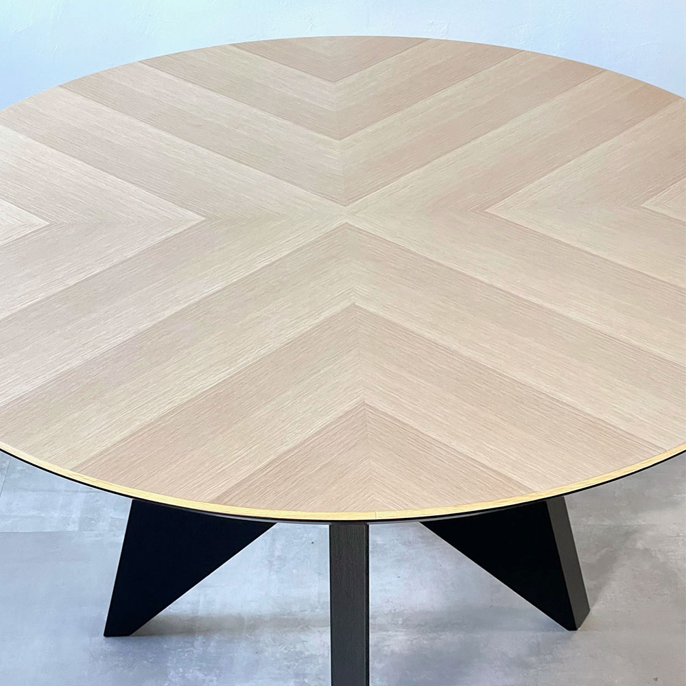 ホワイトオーク木目の丸天板とエッジのきいた直線的な脚部との組み合わせが美しいモダンデザインのダイニングテーブルです。天板には直線的な木目が特長のホワイトオーク材柾目(突板)を使用し、幾何学的なヘリンボーン調に配置することで個性的な表情をつくっています。