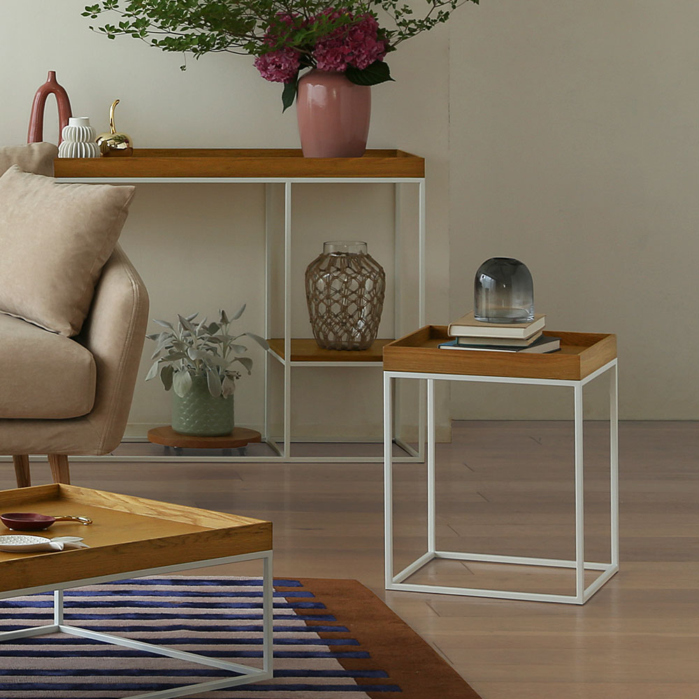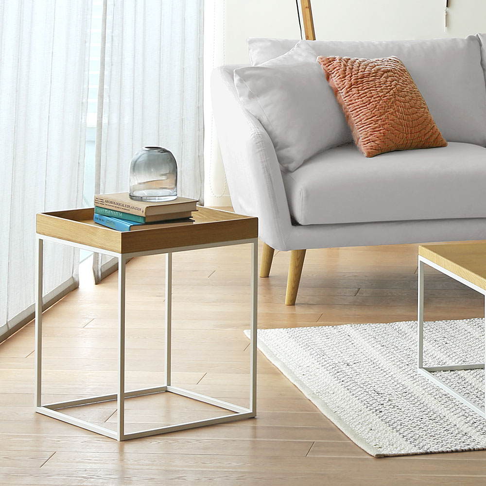 天然木のぬくもりを感じられるホワイトオーク突板とホワイトのスチールフレームを組み合わせたスタイリッシュなサイドテーブルです。配置しやすい直線的な形はどこから見てもすっきりとした印象です。