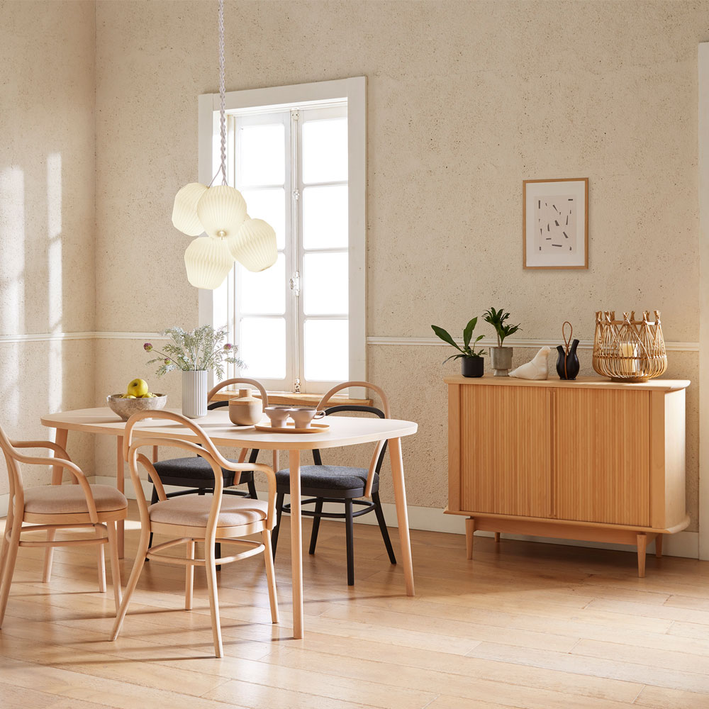 シンプルで洗練されたデザインとビーチの木目の美しさが目を惹くキャビネット。内側に配置された4本脚は、軽やかな印象です。ロールフロントと呼ばれる巻込戸は、奥行のスペースに余裕のない場所でも開閉が可能です。