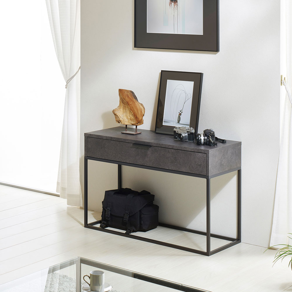 スチールの直線的なデザインが印象的なコンソールテーブルです。インテリア小物や花瓶などをおしゃれにディスプレイ出来るだけでなく、収納に便利な引出し付きです。高さ59.1cmのロータイプです。IRシリーズのリビングテーブルやパモウナの他シリーズのアイテムとカラーを揃えることができ、統一感のあるインテリアを可能にします。
