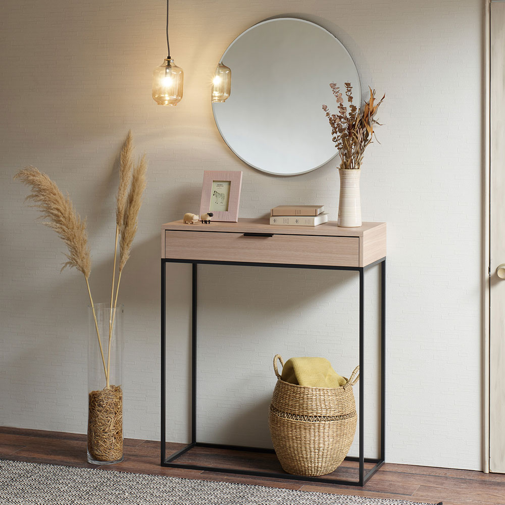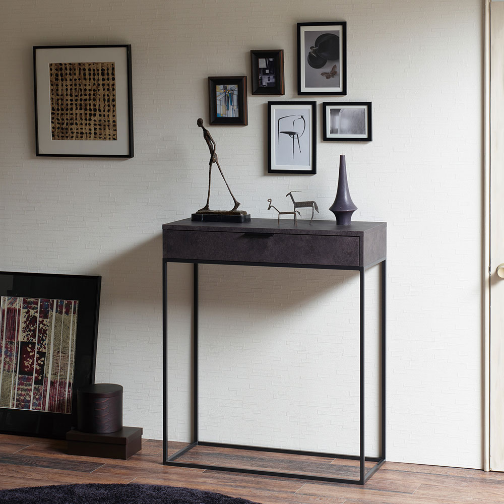 スチールの直線的なデザインが印象的なコンソールテーブルです。インテリア小物や花瓶などをおしゃれにディスプレイ出来るだけでなく、収納に便利な引出し付きです。IRシリーズのリビングテーブルやパモウナの他シリーズのアイテムとカラーを揃えることができ、統一感のあるインテリアを可能にします。