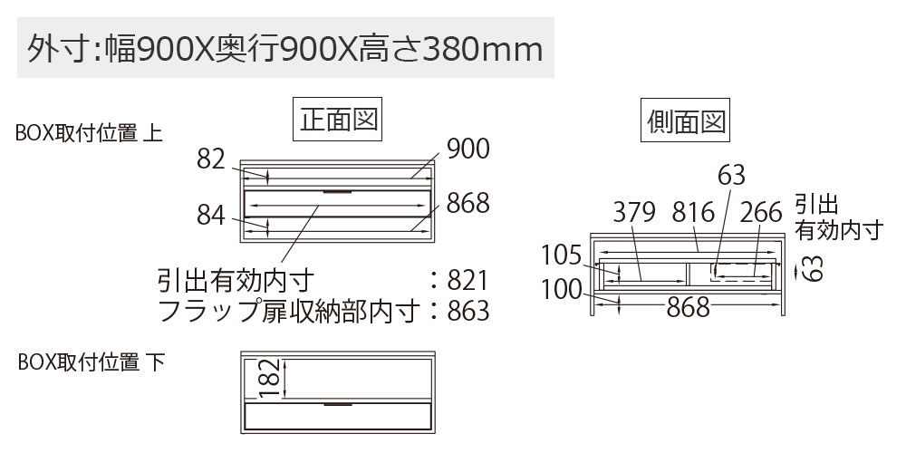 片側に引出し、片側にフラップ扉がついたBOX付タイプです。見せる収納と隠す収納を兼ね備えたリビングテーブルです。
