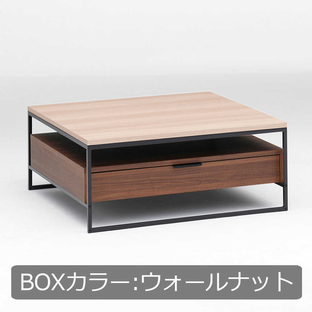 片側に引出し、片側にフラップ扉がついたBOX付タイプです。見せる収納と隠す収納を兼ね備えたリビングテーブルです。
