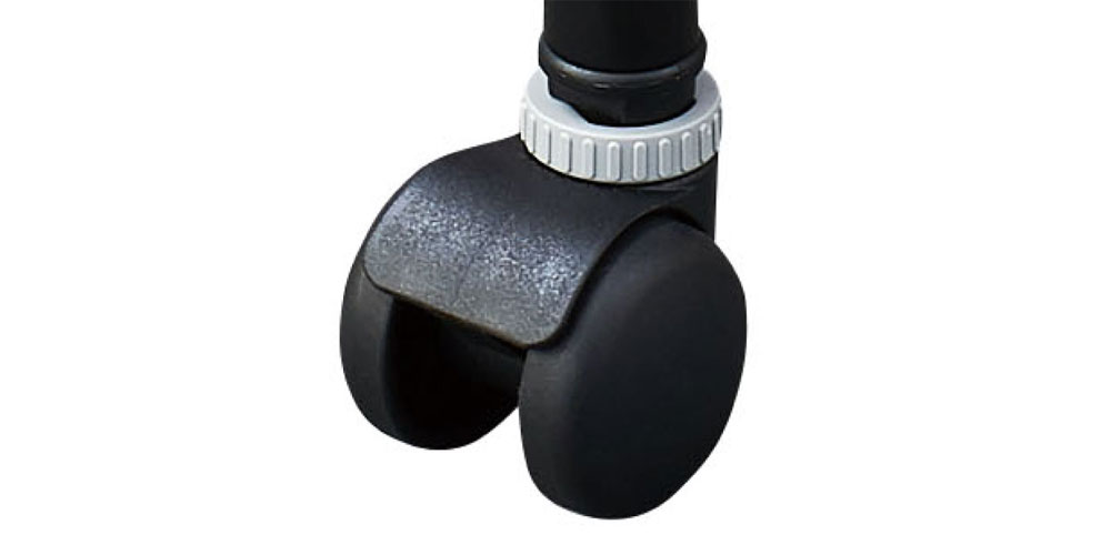 切替リングを回しレバ先ーを■側に合わせるとストッパーがかからず車輪が回ります。レバー先を●側に合わせますと、荷重でキャスターの軸が沈み込んでストッパーがかかり車輪の回転が止まります。落ち着いて座れます。