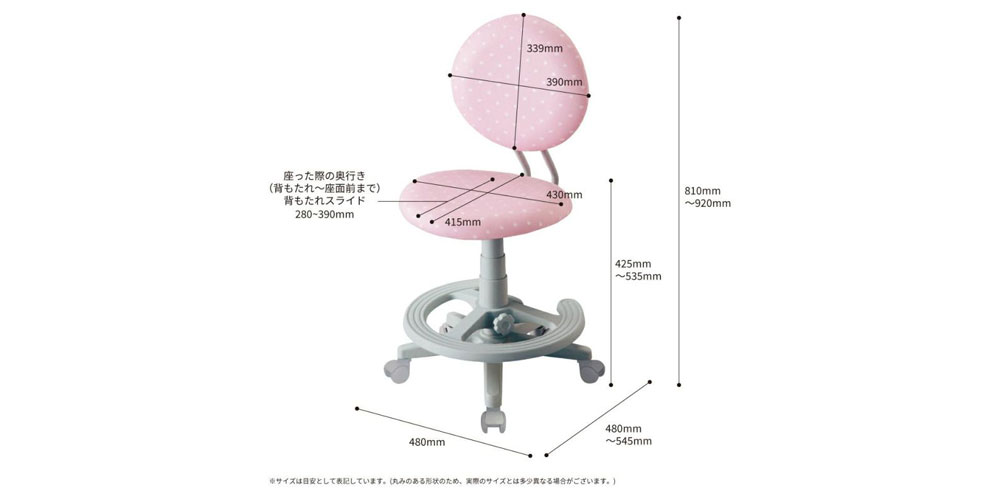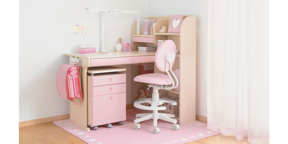 昇降レバーもハート型です。小学校中学年から高校生向けチェアです。前後に大きくスライドする座面で小柄な方にもピッタリフィットします。